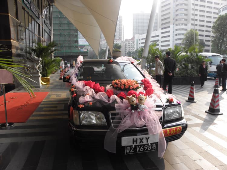 中国では結婚式の朝、装飾された黒塗りの高級車に乗り込み、新郎を待つ花嫁を迎えに行きます。