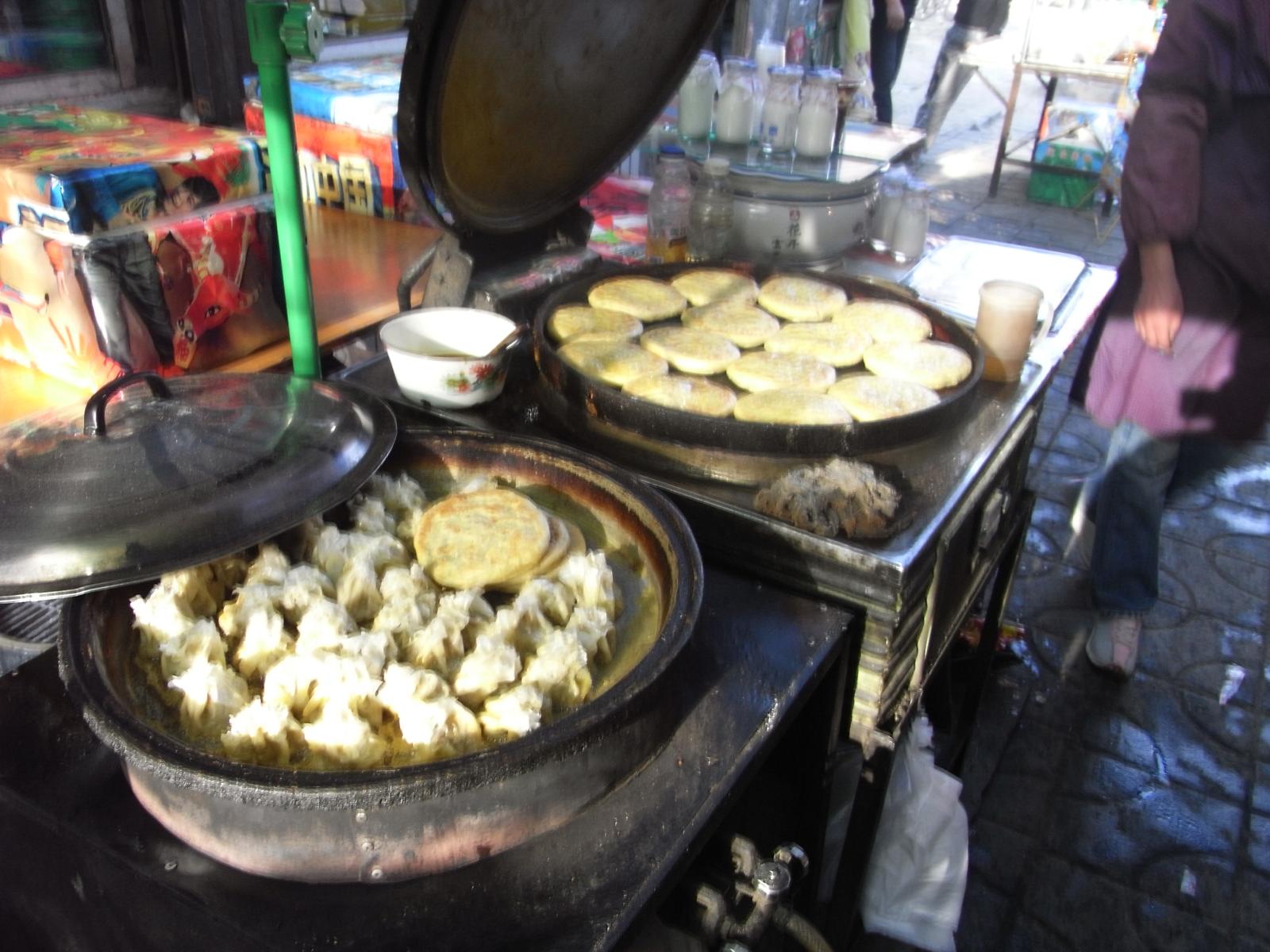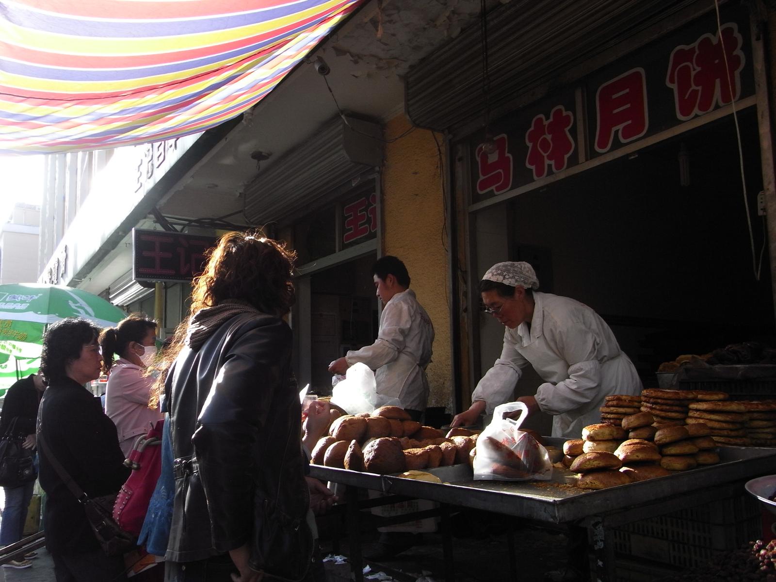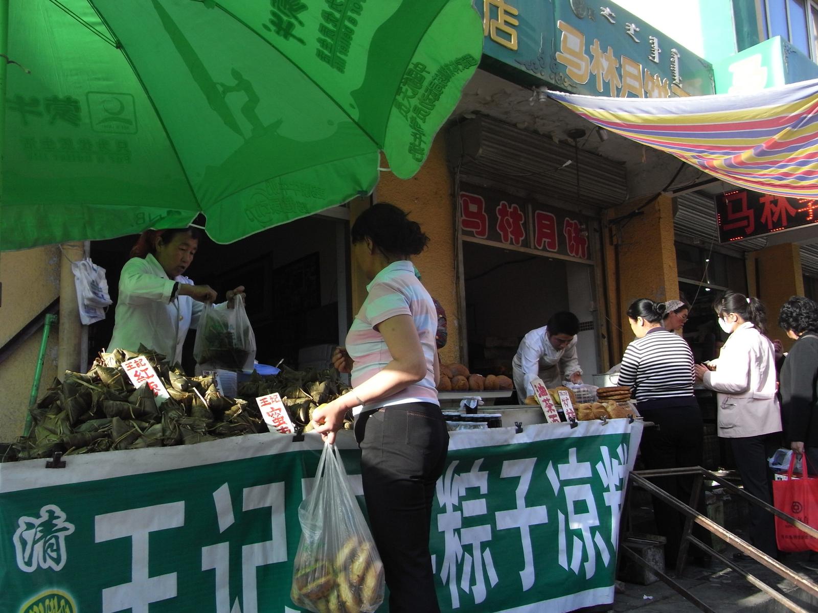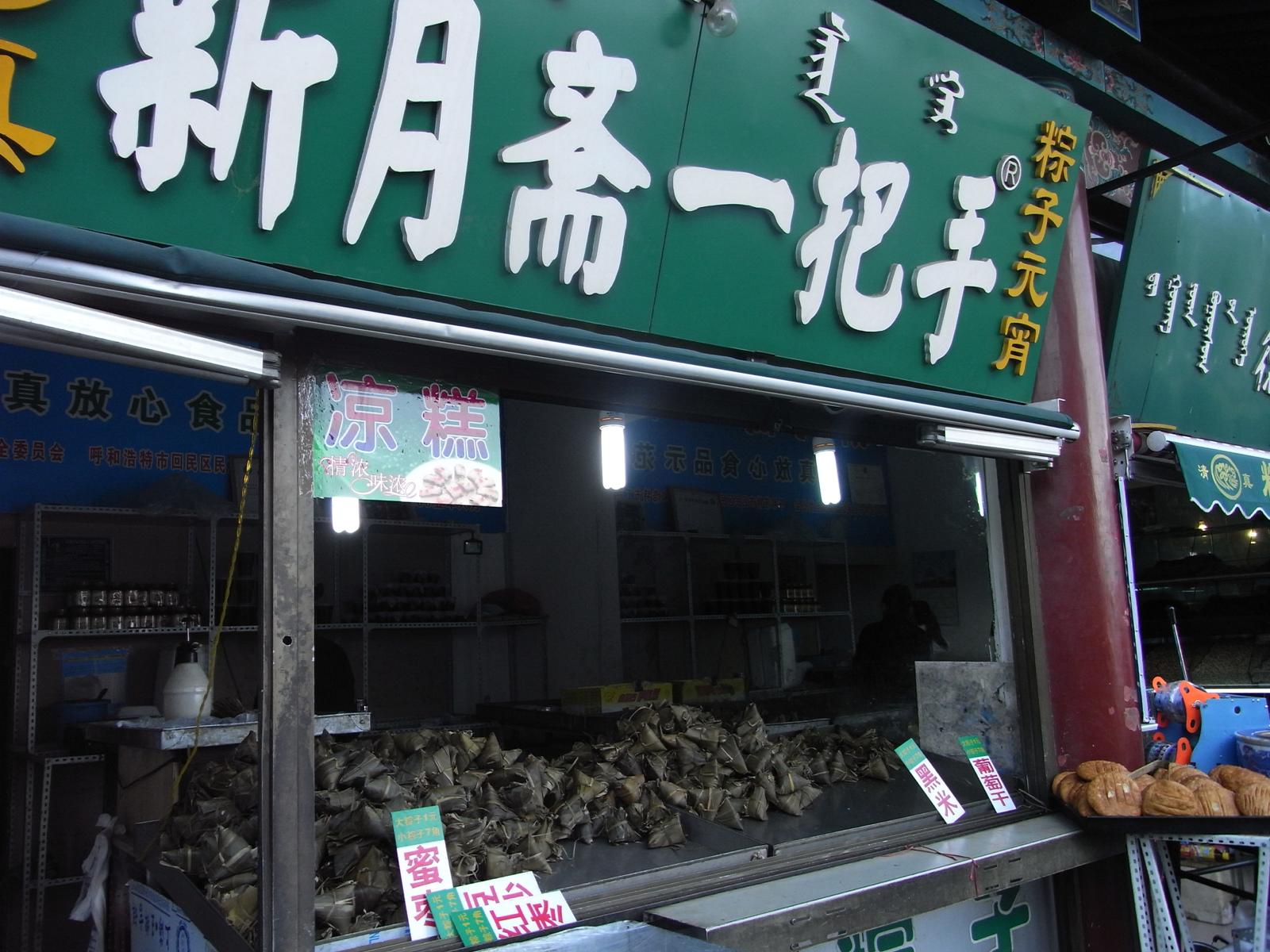 (モンゴルB級グルメ店。粽屋さんが見えます。赤棗入りの粽もありますね。また月餅屋さんもあります。)