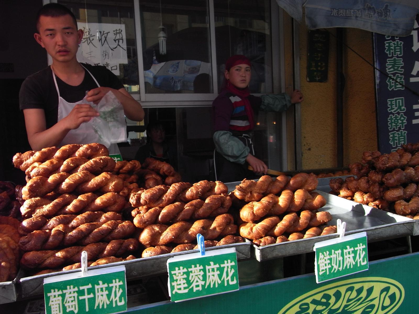(干しブドウ入りや蓮入りの麻花を売っています。)