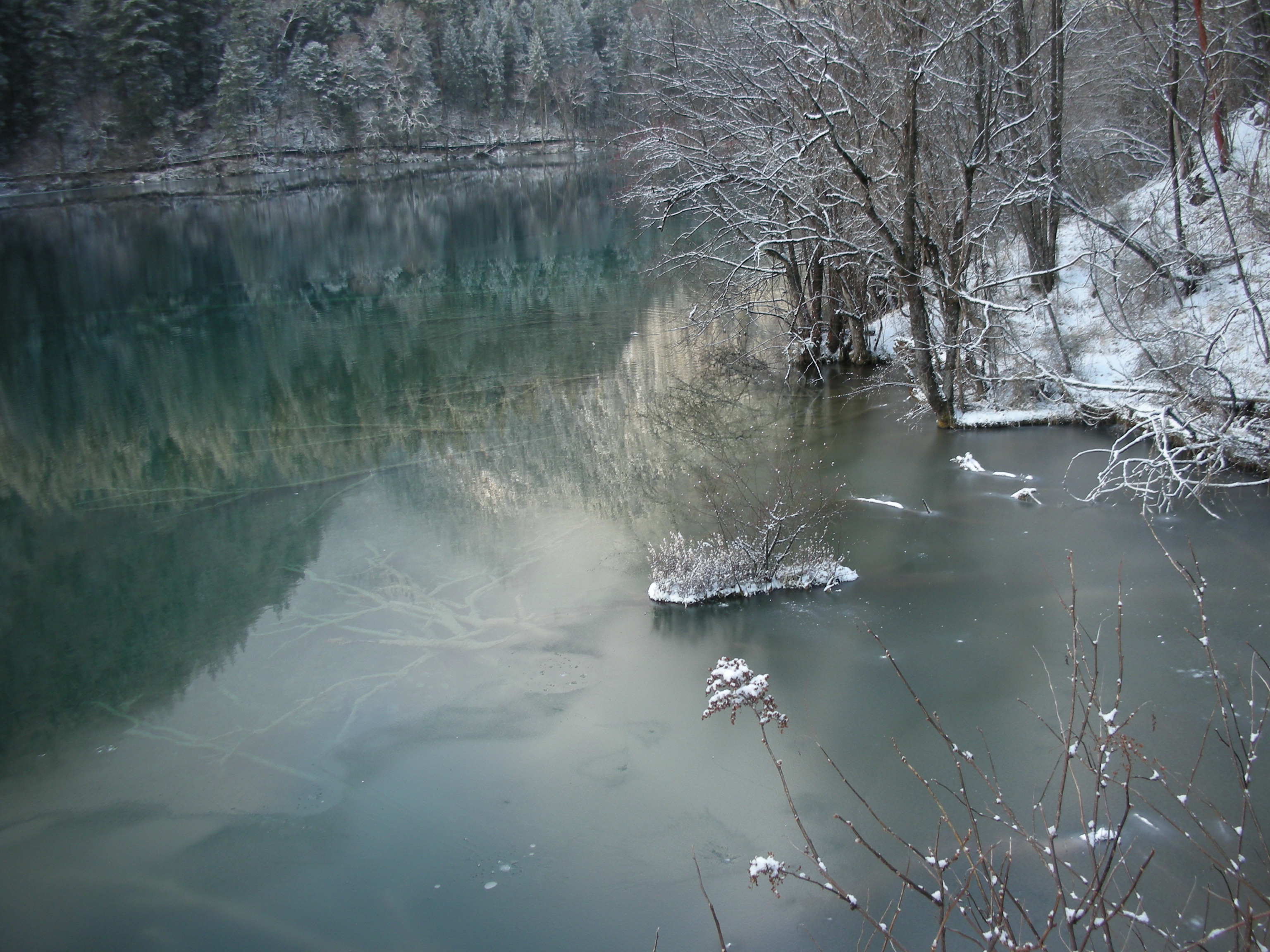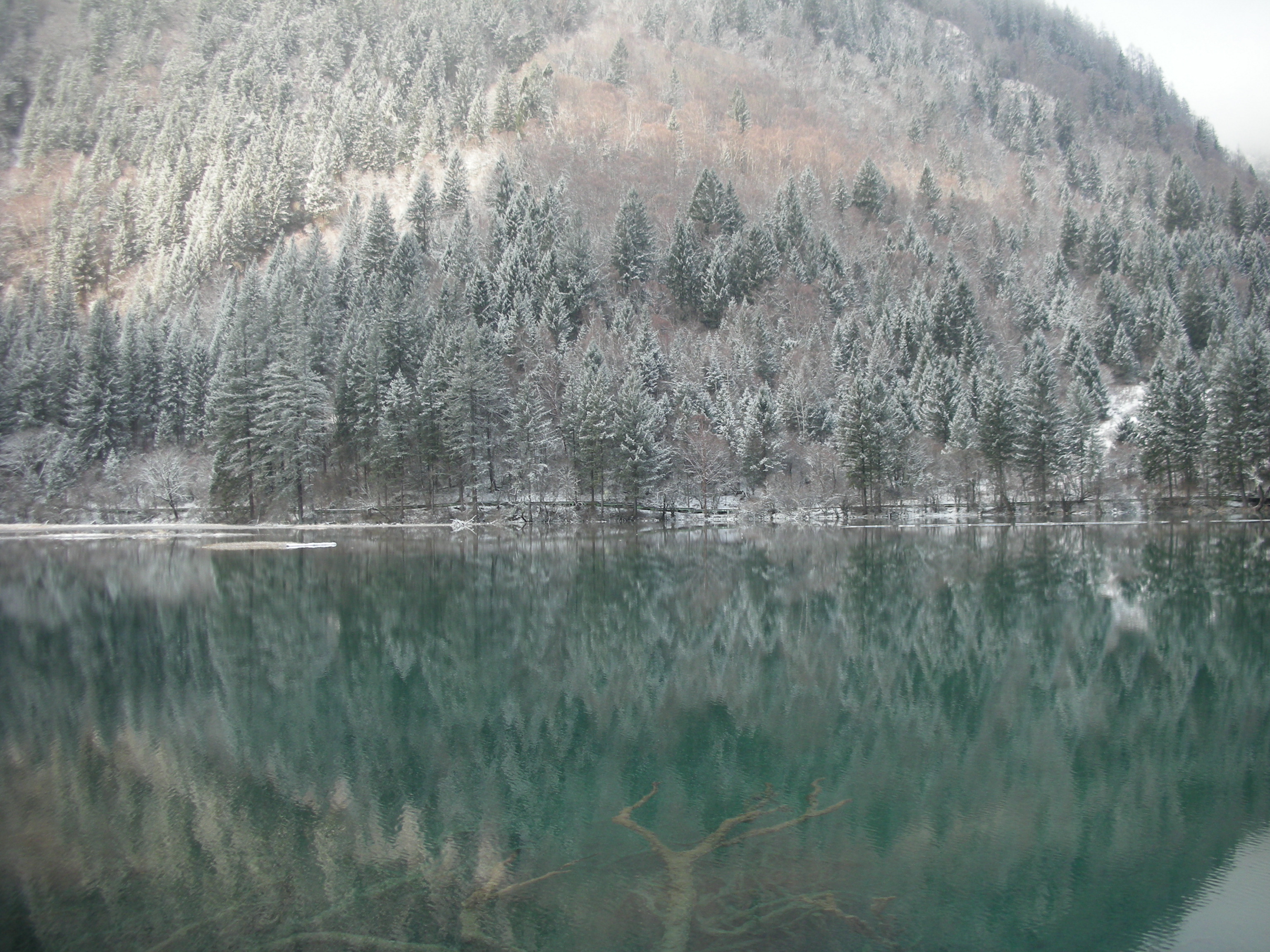 (九塞溝が見えてきました。雪の中、透き通った水が美しいです。)