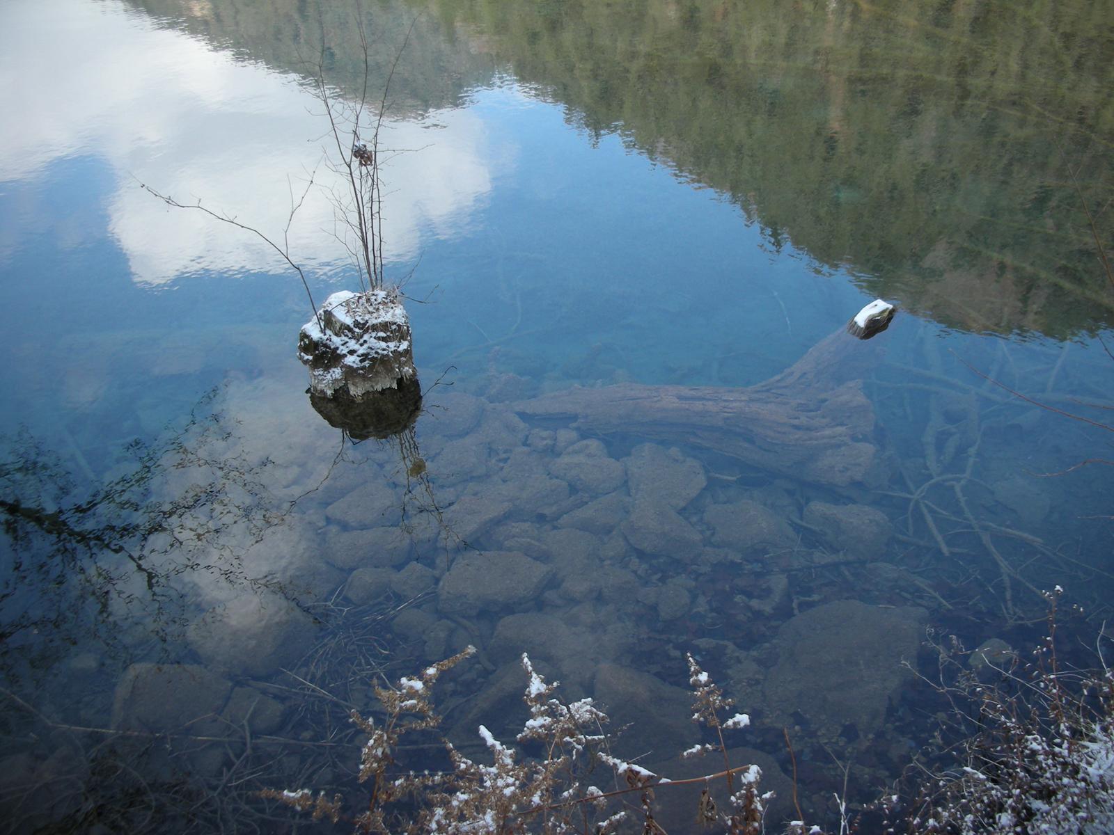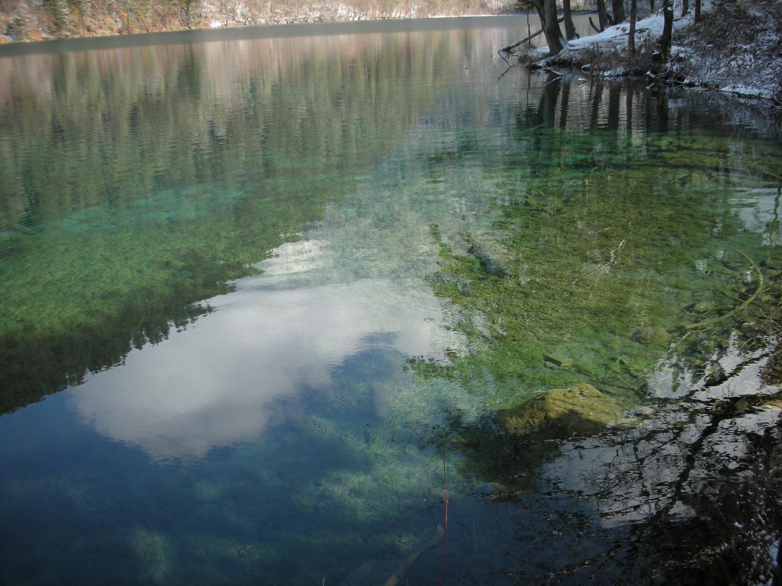 (水に含まれる石灰に浄化作用があるため、湖底に沈んだ大木もくっきり見えます。)