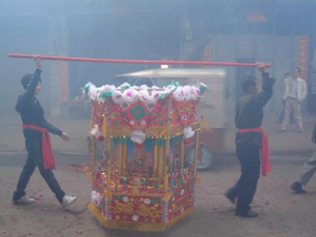 (広州梅州の客家の御神輿。祖先を祀る人形がたくさん入った御神輿を担ぎます。)