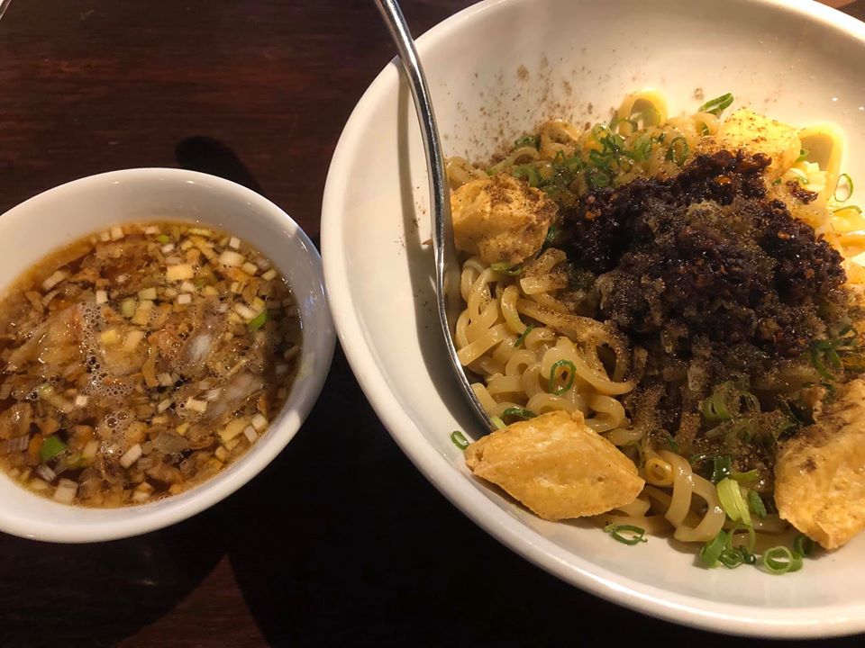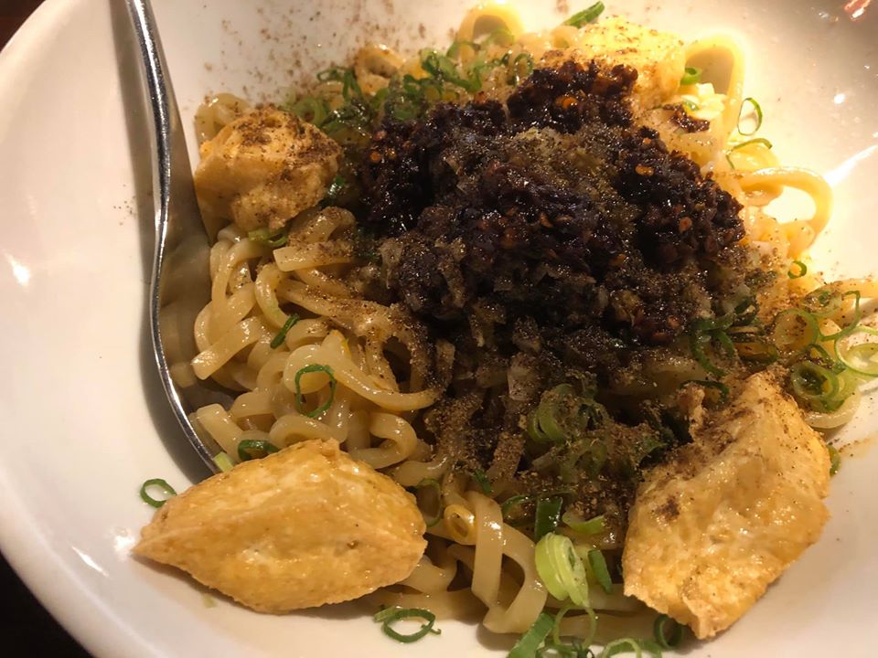 注文してしばらくすると麺と油かす入りの少量のスープが添えられて出てきます。食べ方は油かす入りスープをお好み量だけかけ、かき混ぜて出来上がりです。タピオカ入りのモチモチで腰のある麺に麻辣な味を絡めることで旨みが口の中に広がります。まぜ麺なので混ぜて豆腐が崩れないように豆腐は厚揚げにしているようです。