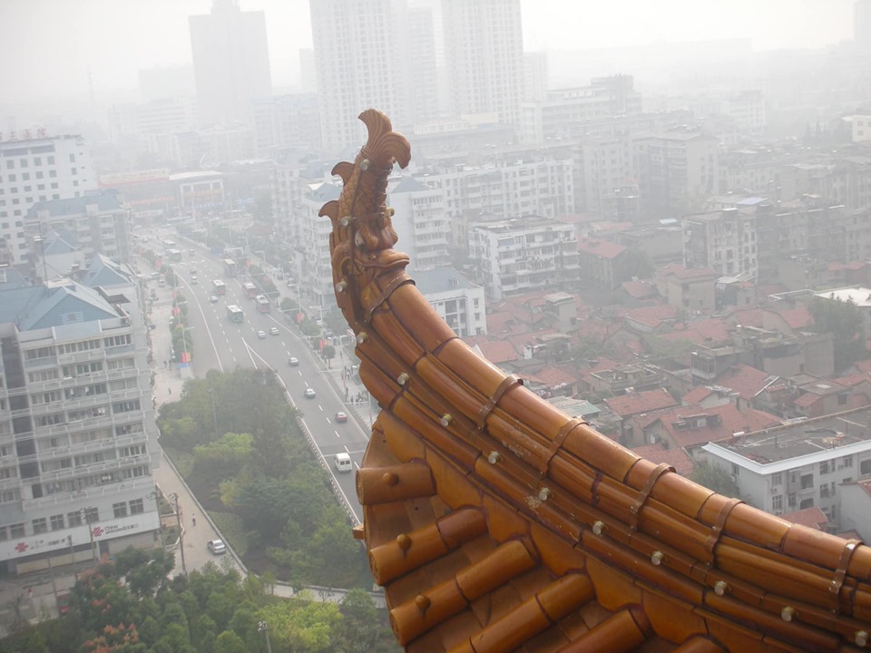 (黄鶴楼の天守閣から見た武漢市内。黄鶴楼は何度も戦災などで建て直されています。この日は霧が出ていました。.)
