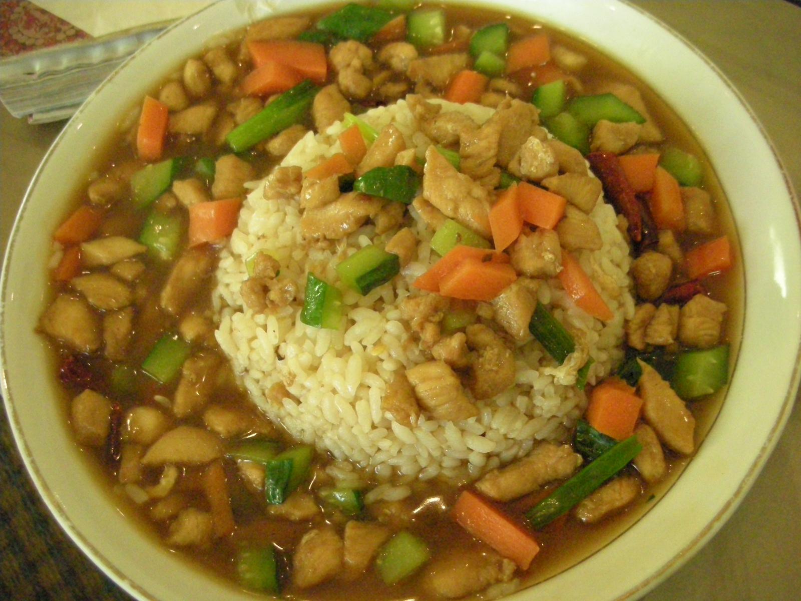 (鶏肉とキュウリに甘酢を絡めた物をご飯にかけたもの。これも美味しかったです。)