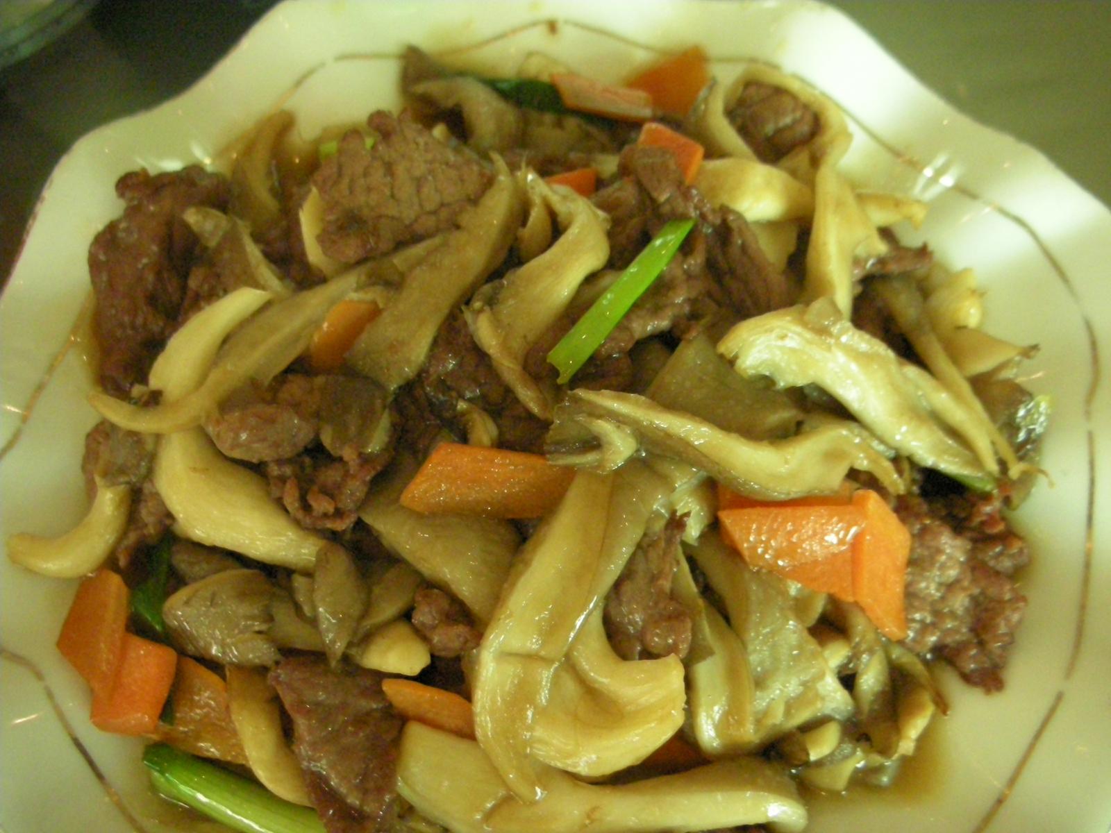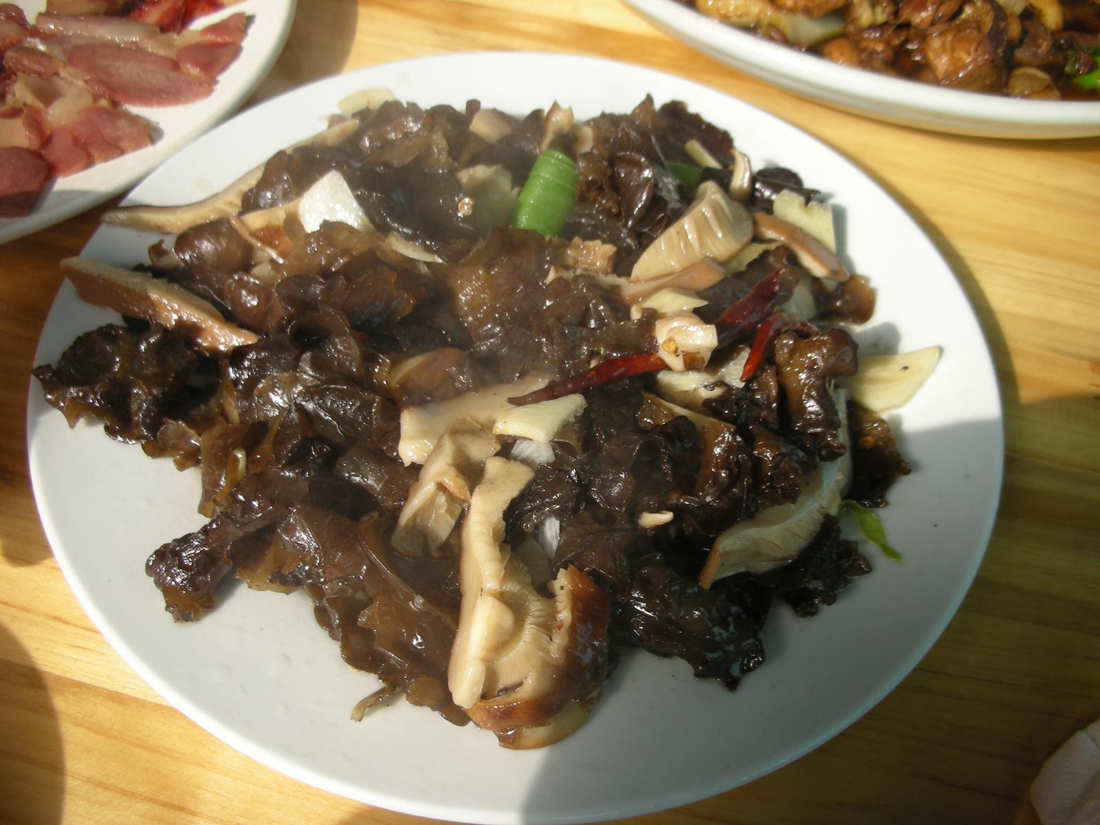 (きくらげとキノコの炒め物。きくらげは少し臭みがあります。)