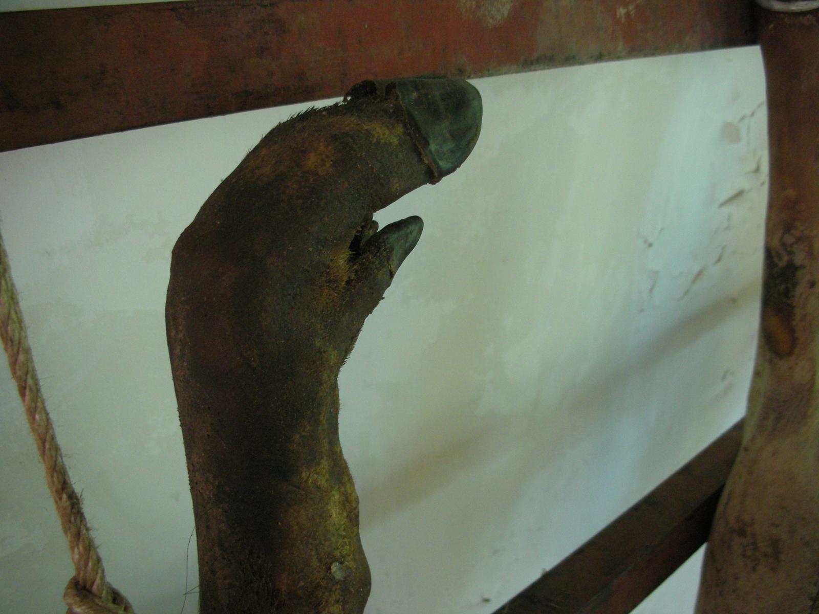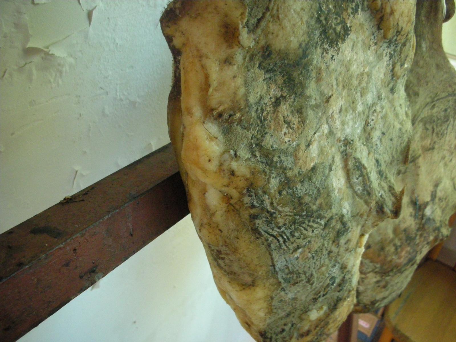 (豚の後脚に塩を塗りつけて、自家製の生ハム作りしていました。)
