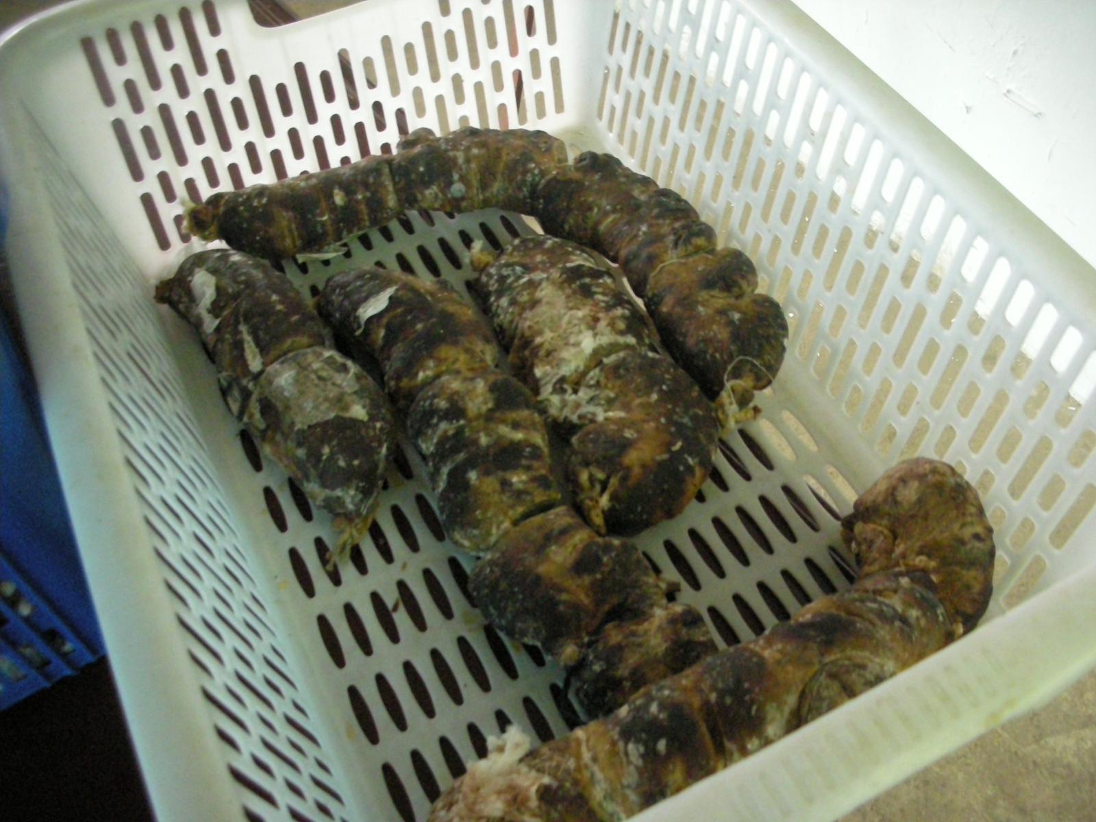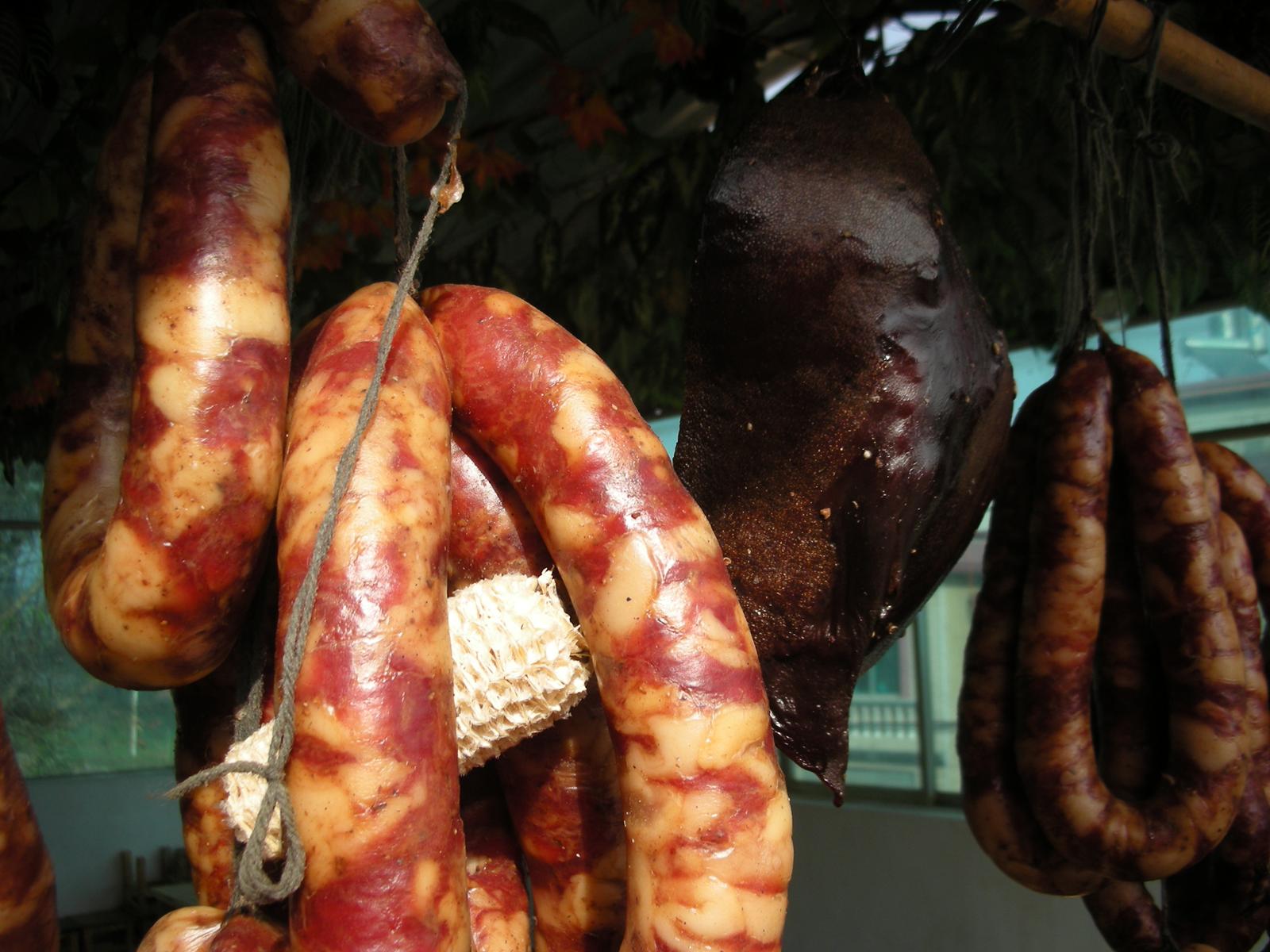(豚のソーセージ。左が大腸詰め、上が腸詰、下が豚の後脚の生ハムです。)
