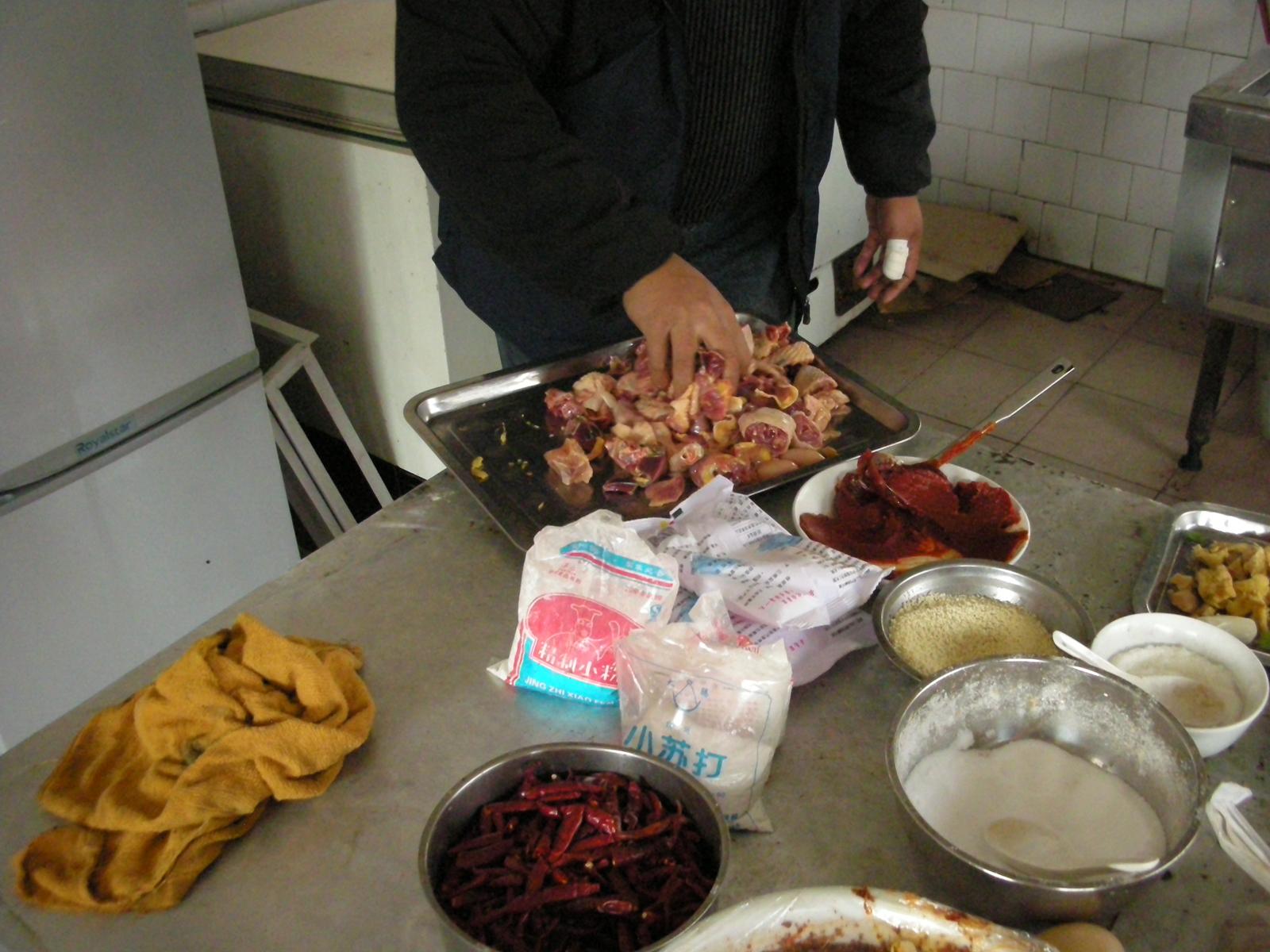 (ぶつ切りにした鶏肉に調味料をつけます。)