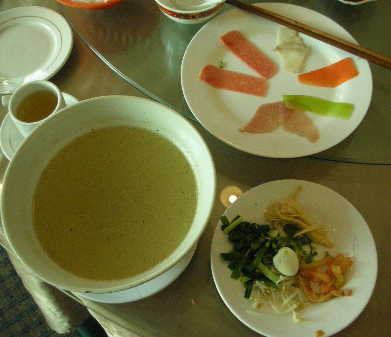 (過橋米線のスープと具。スープはコクがあるメス鶏より取るそうです。)