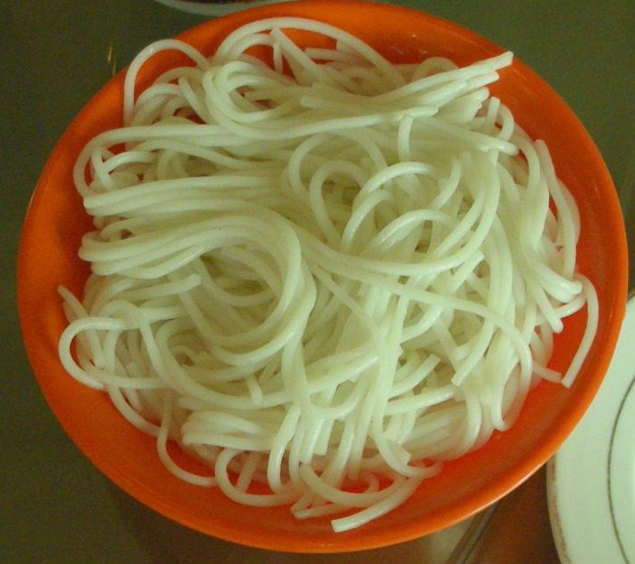 鶏ガラスープの碗、麺の碗、肉がのった皿、野菜・湯葉が入った皿、合計4つが運ばれ、まずお肉を入れて、しゃぶしゃぶし、それから麺、具を入れて完成です。麺は、米の粉で作った米線を出す店が多いです。この過橋米線は、昔、科挙の勉強に励む主人のために、熱い麺が冷めないように運ぶために、妻が橋を渡って具を分けたものを運んだというという言い伝えから、この麺の名前が「過橋米線」となったそうです。