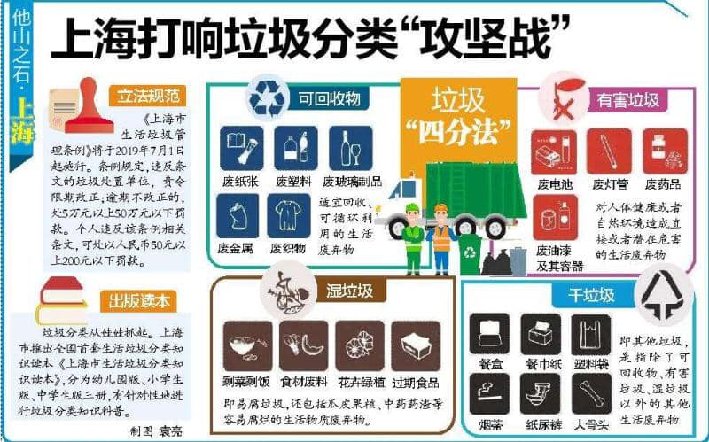 今年7月1日より上海市は正式にごみの分類を実施することとなりました。 個人および企業はごみの分類の規則に従わなければ個人の場合は最大二百元の罰金となり、企業が分類しなかったり、遠くに運んで投棄した場合は最大で五万元の罰金が科せられます。 これは中国史上最も厳しいごみの分類と言われています。