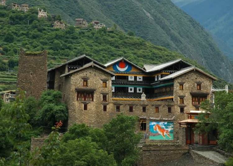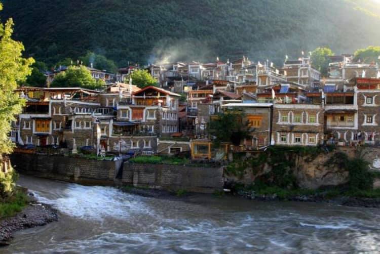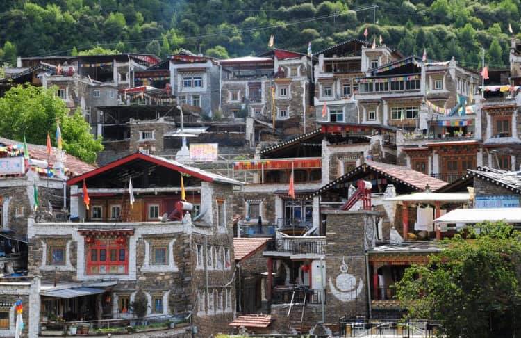 成都方面の手前、卓克基にある土司官寨や西索民居は煉瓦造りの建物が美しく、壁が白い漆喰で綺麗に塗り固められ、窓枠が赤で塗られている石造りの家が立ち並んでいます。またシンプルな石造りで窓が白で塗られているものもあります。特に点在する約30mもある、八角形の見張り台の塔はこの地方独特のものです。