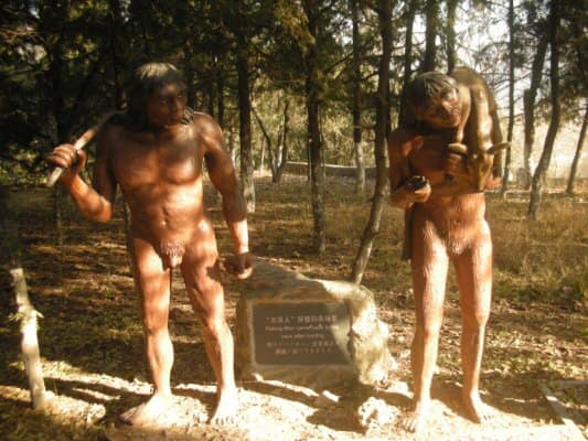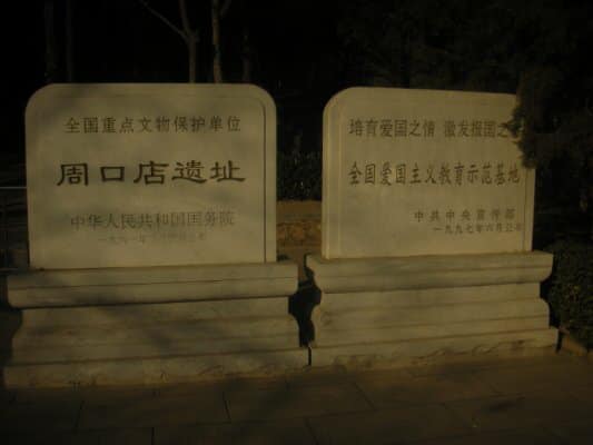 北京の南西方向に約50kmにある龍骨山という石灰岩から成るなだらかな丘陵の一部が陥没して巨大な穴状になっており、その側面から多数の動物化石に混じって人骨と石器が発見されました。最初に見つかったのは一個の歯だけでしたが、その後発掘が進み、頭蓋骨も発見され、洞窟からは火が使用された跡も見つかりました。さらに第二次世界大戦後には山頂の洞窟からも人骨が発見され、こちらは新人に該当する周口店上洞人と名付けられています。