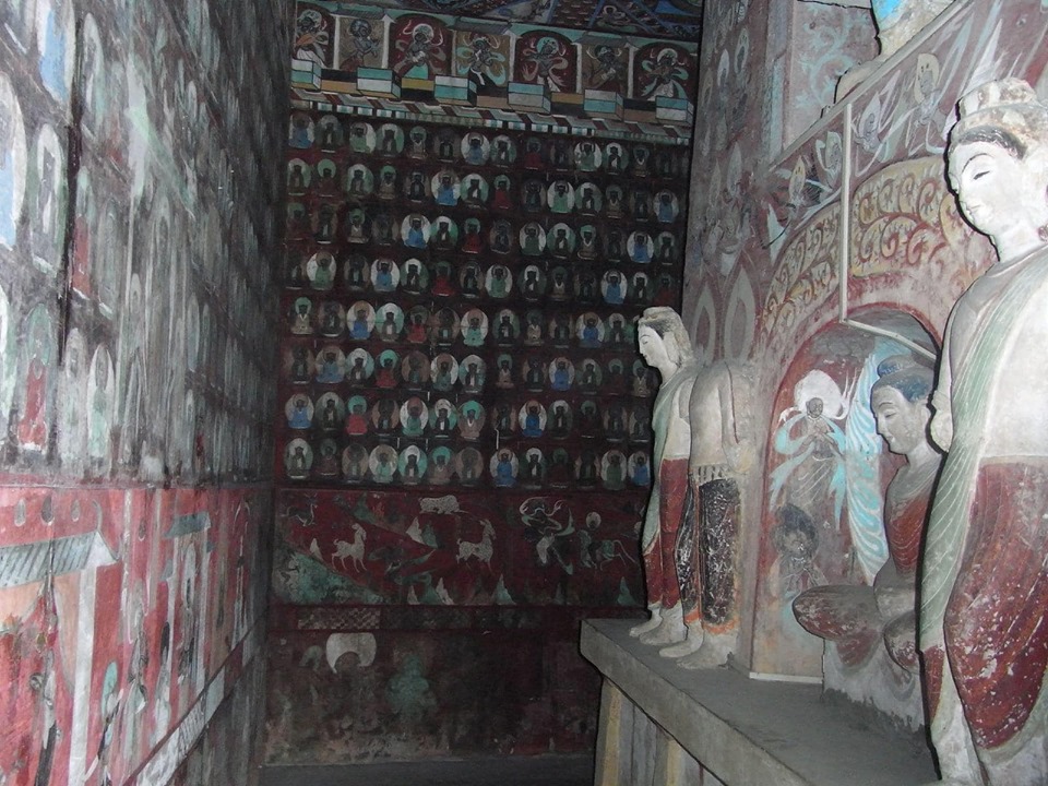 (2)莫高窟-甘粛省敦煌市にある仏教遺跡。4世紀から約千年間、元代に至るまで彫り続けられた。大小492の石窟に彩色塑像と壁画が保存されており、仏教美術として世界最大の規模を誇る。