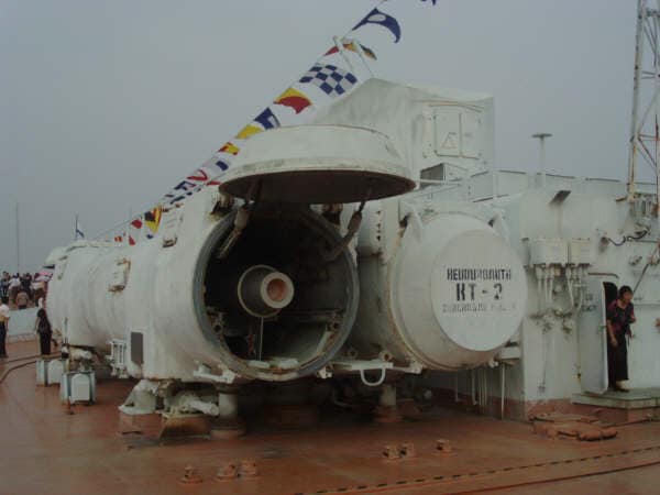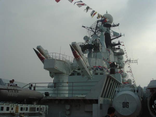 ミンスク号は全長約300メートル、高さは22階建てのビルに相当する巨大空母です。艦内には全長約8メートルの魚雷やミサイル貯蔵庫、航海用品や軍服など旧ソ連海軍にまつわる品々が展示されており、広い戦闘機格納庫ではロシア歌舞団によるパフォーマンスも見られました。甲板には発射台にセットされたミサイル、ミグ戦闘機やヘリが見学できるほか、儀典兵のデモンストレーションも行われ、人気を呼んでいました。