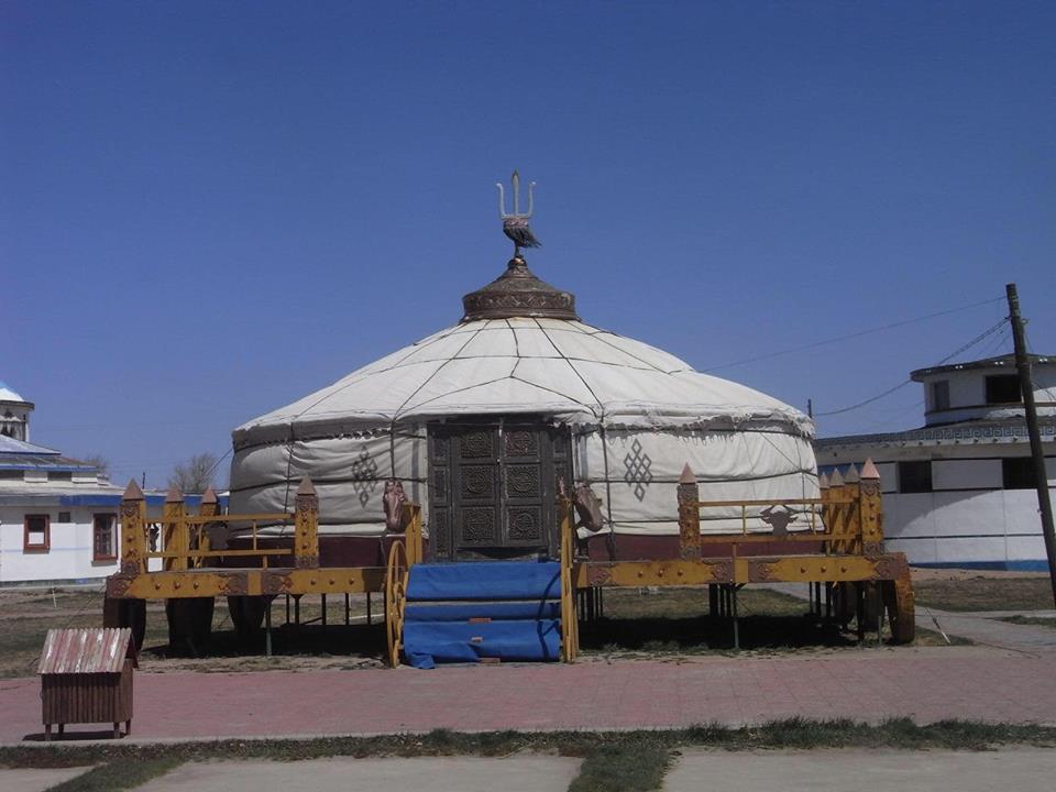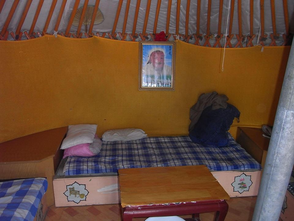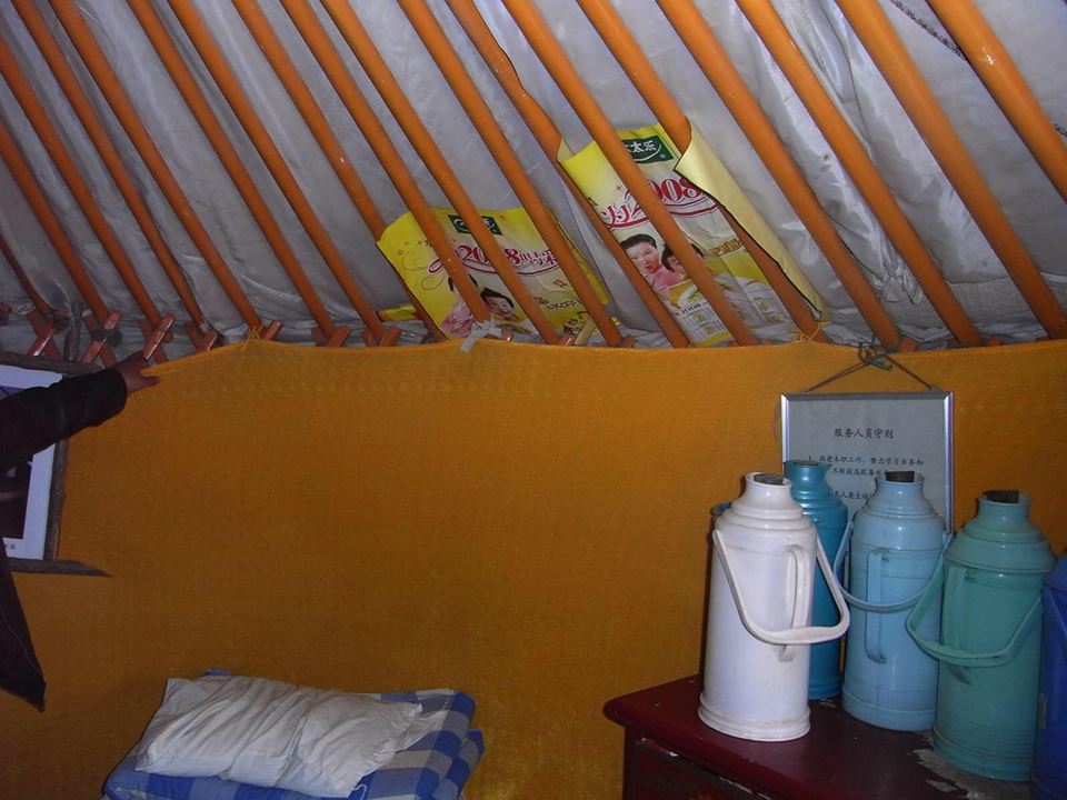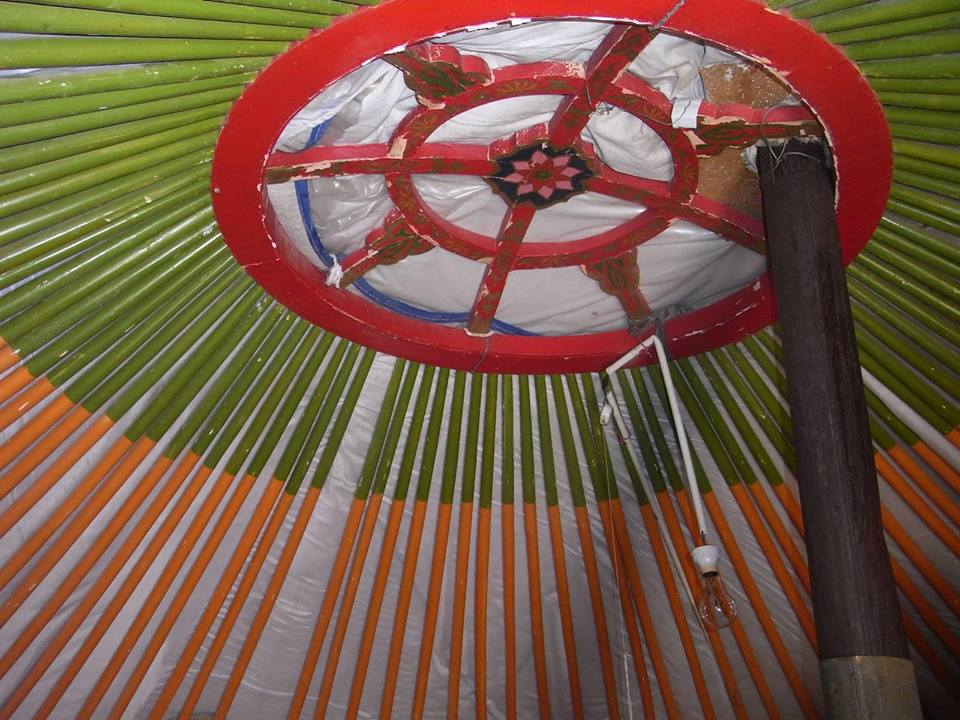 遊牧生活を営なむモンゴル民族が住むのはゲルと呼ばれる外側がほぼ白一色との素朴な移動式組立住居。しかし内部はそんな外見からはちょっとと想像もつかないくらいのカラフルさ。ゲルの側面には窓がなく、天窓からの採光のみ。換気や明るくしたいときには扉をあけて外光を入れます。