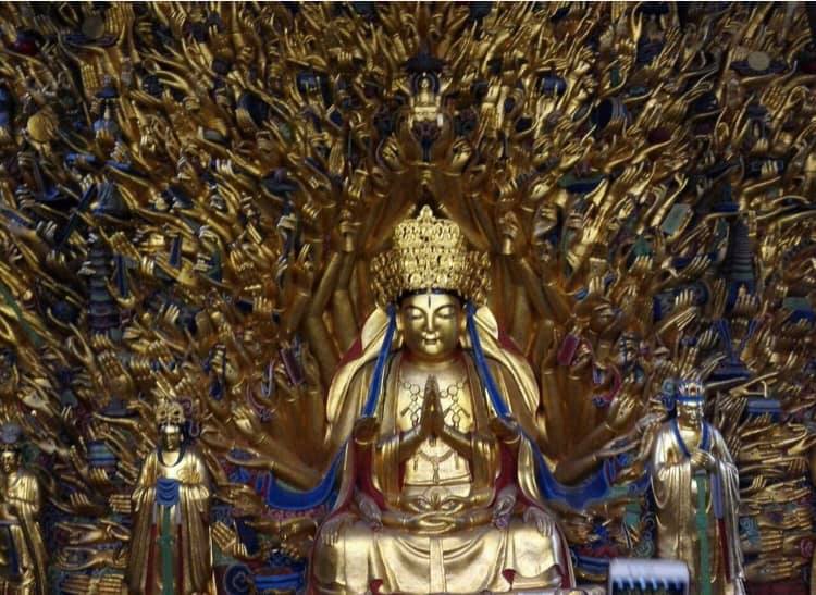大足石窟の目玉はなんといっても世界最大といわれる全長31mの釈迦涅槃像。その安らかに眠る巨大な姿に誰もが圧倒されますが、何か癒されます。また黄金に輝く千手観音像は1,007本の手があり、見るものを圧倒します。