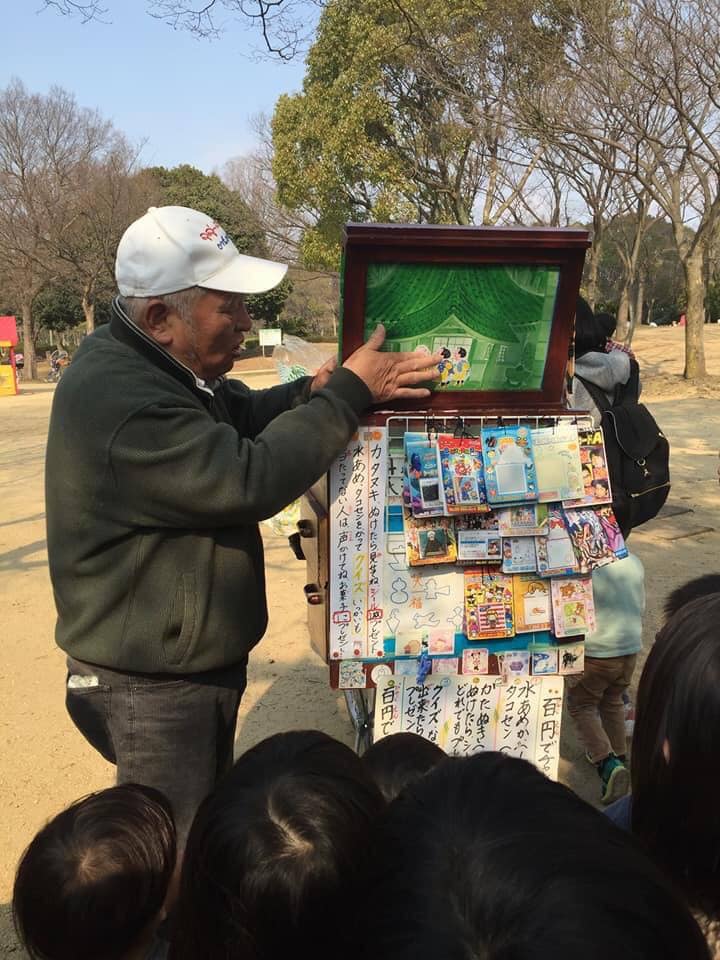 (仁徳天皇陵前は広い公園が多く、市民の憩いの場となっています。昔ながらの紙芝居もしていました。)