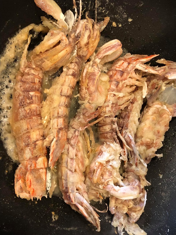 (生きたシャコに小麦粉をまぶしてそのまま炒めます。)