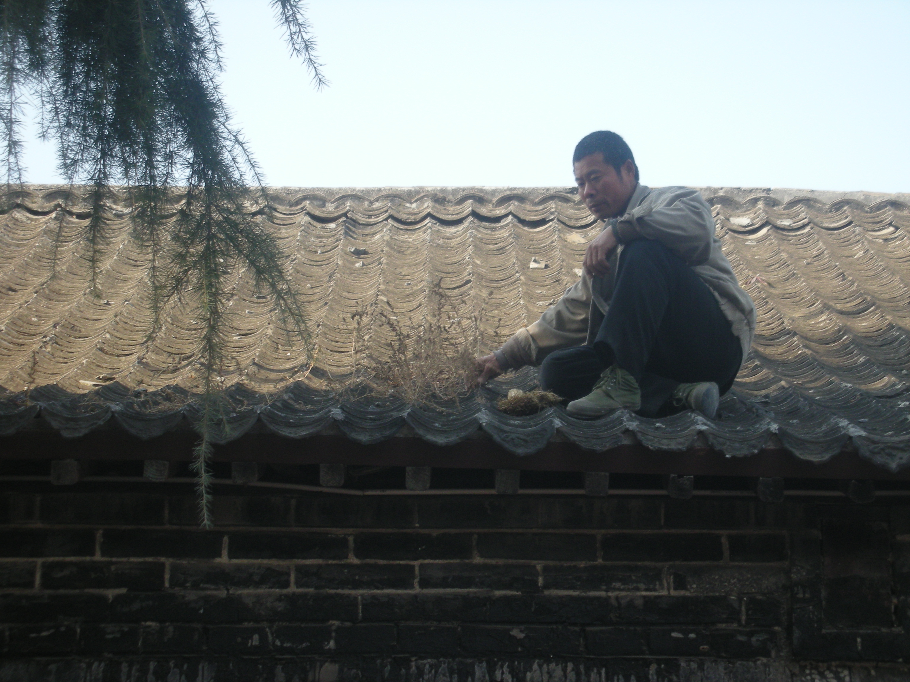 (屋根を掃除する人。)