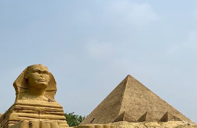 (エジプトのアブ・シンベル神殿。オリジナルは砂岩でできた岩山を掘り進める形で作られた岩窟神殿で、ラムセス2世という王様の青年期から壮年期までの4つの姿を模したものとなっています。)