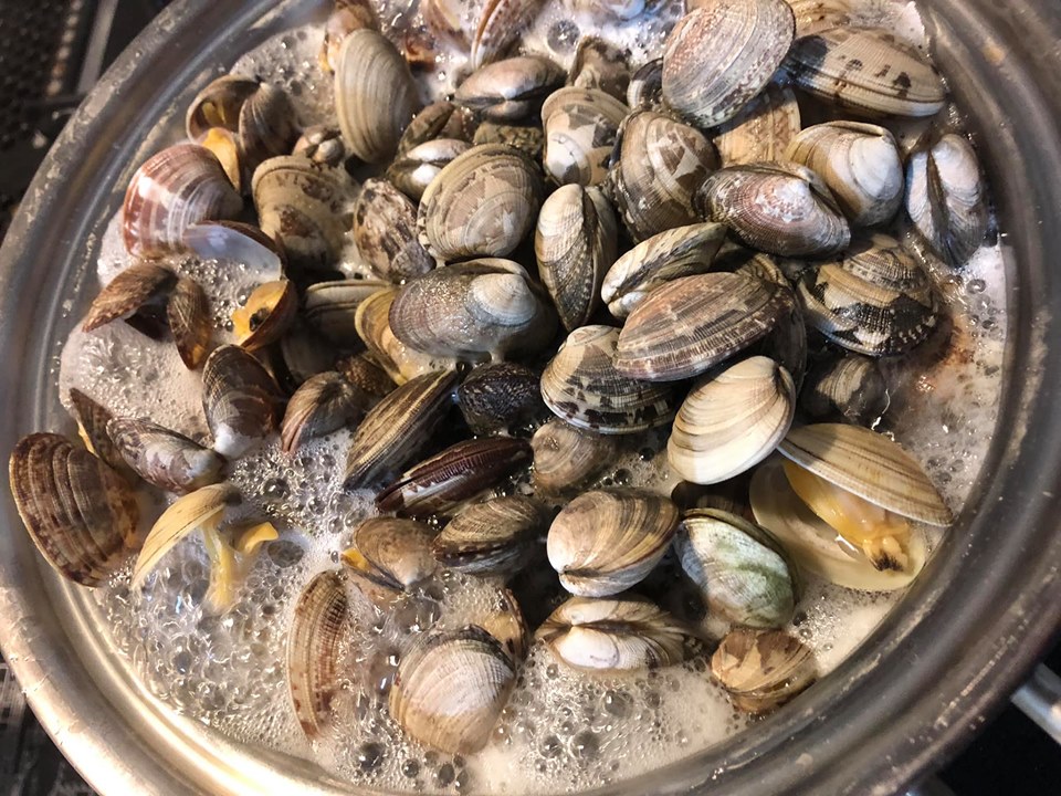 2、料理酒を入れ、フタをして、アサリの殻が開くまで蒸し焼きにする。