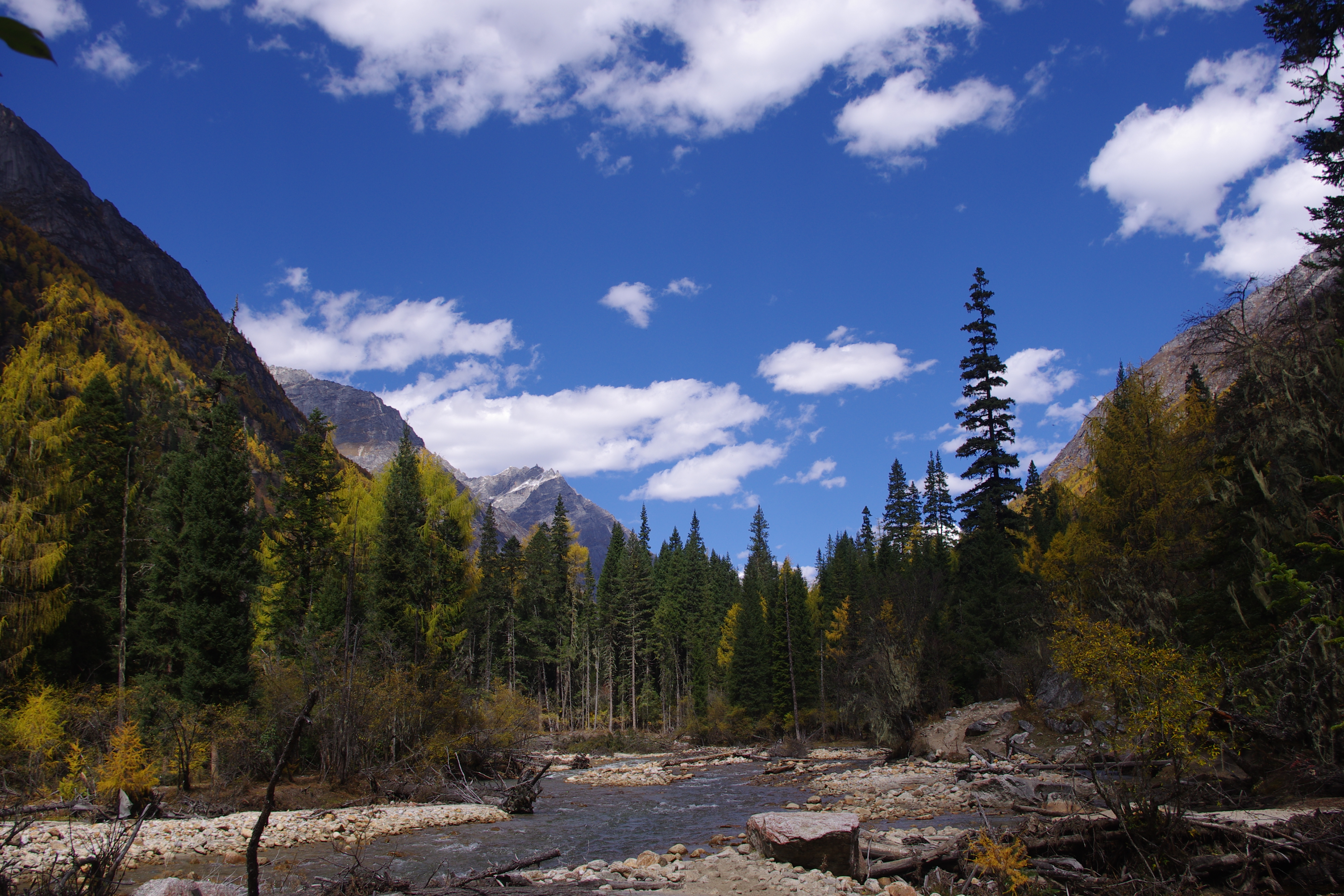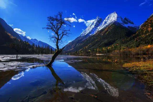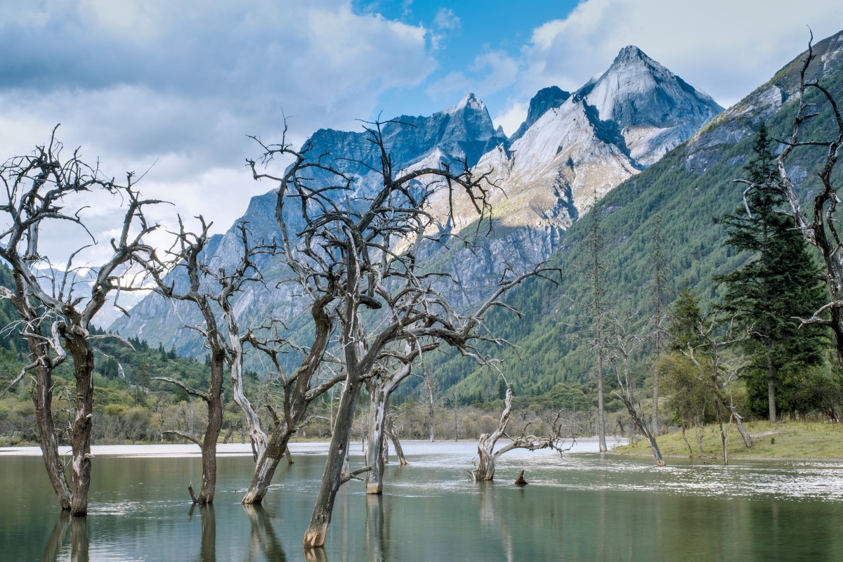 四人姉妹とは、長女の大姑娘山(標高5335m)、次女の二姑娘山(標高5454m)、三女の三姑娘山(標高5664m)、末娘の四姑娘山(標高一番背が高くて6250m)のことを指します。たくさんの自然風景を楽しめ、中国のアルプスと呼ばれています。