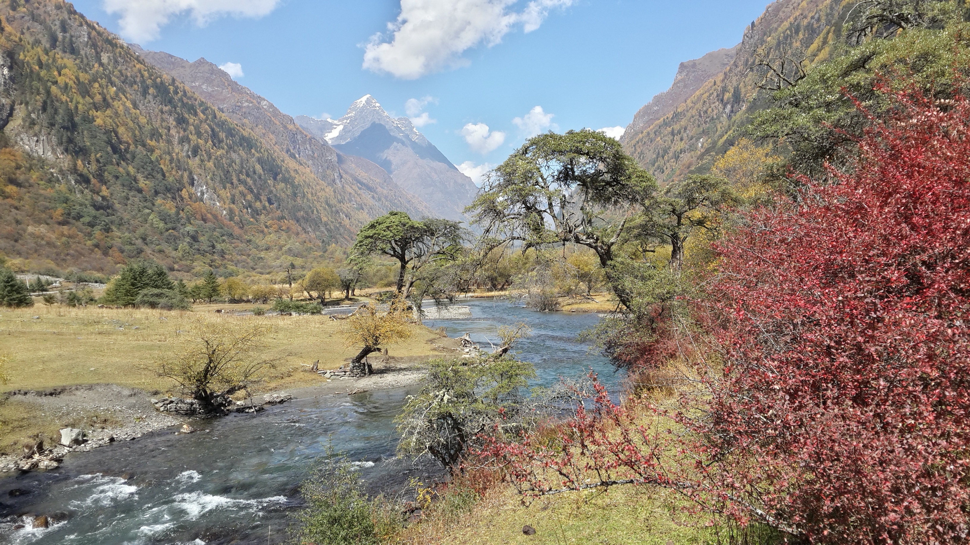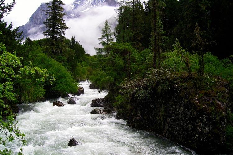 (四姑娘山 双橋溝。チベット仏教のタルチョが見えます。)