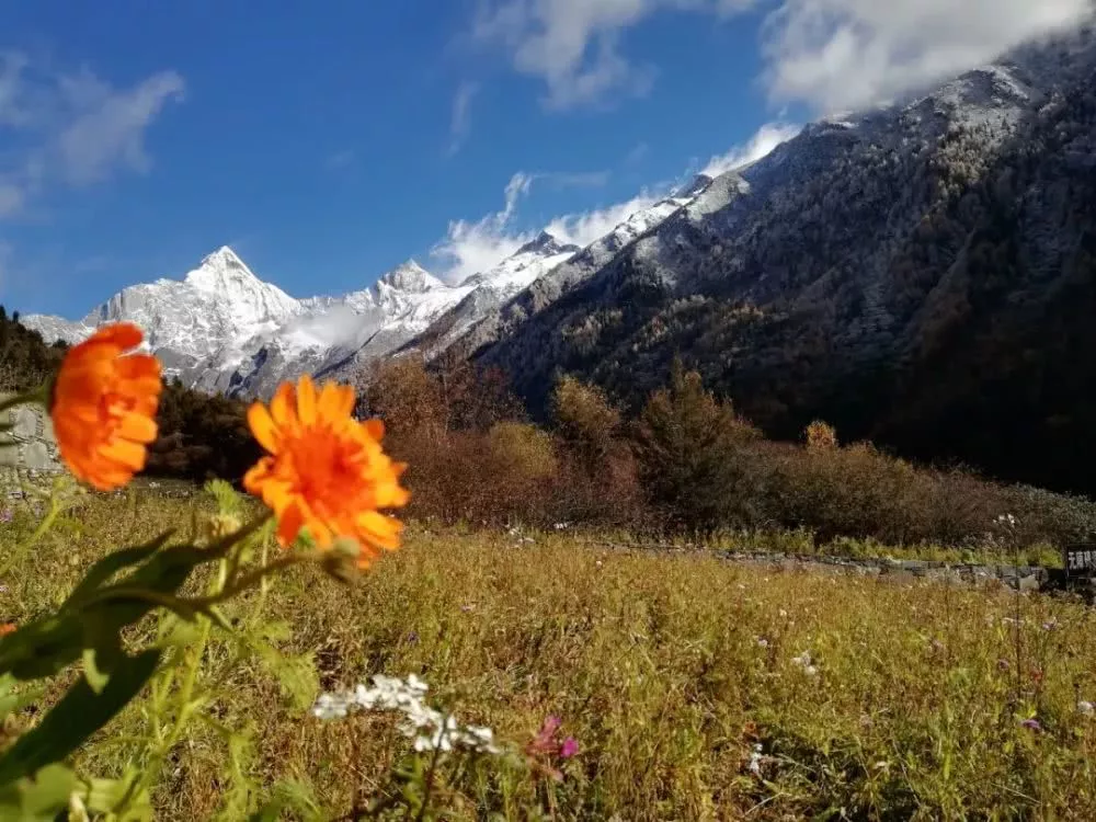 これらの山々はいずれも高山植物の宝庫であり、幻の花といわれるブルーポピーをはじめ、さまざまな希少な花が咲き乱れています。特に山の麓には長坪溝や、双橋溝や海子溝では高山植物のお花畑が堪能できます。海子溝には10数個の高山湖があり、 軽い風が吹いてくると、湖面上の波がまるで真珠のように波たちます。青空と白い雲の影が美しく湖面に映しだされ、周りの山峰もまるで湖面上で静かに眠っているかのようです。