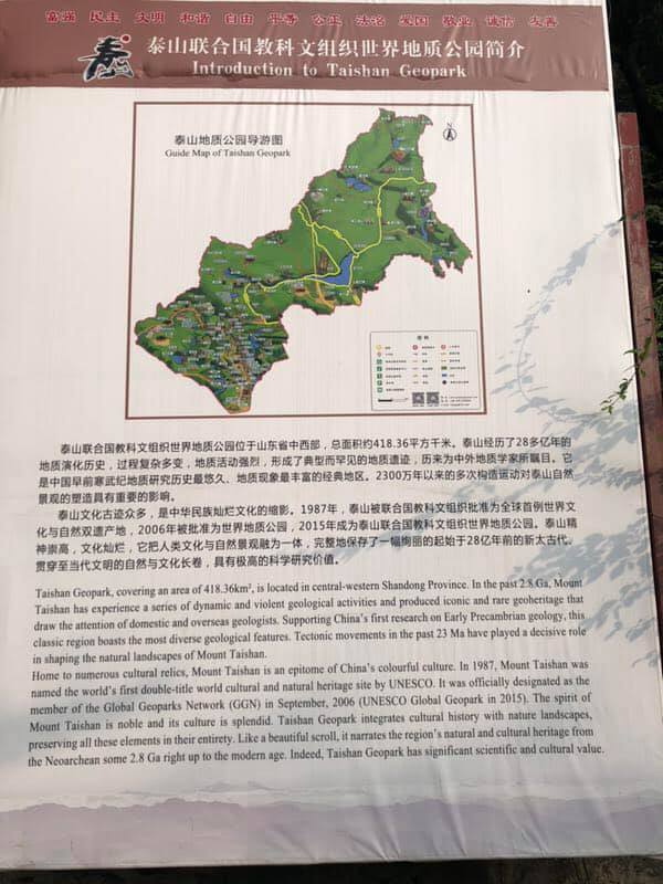 (泰山の紹介。山頂まで約9キロの道のりであり、この間ずっと石の階段7000段が途切れも無く続いている。)
