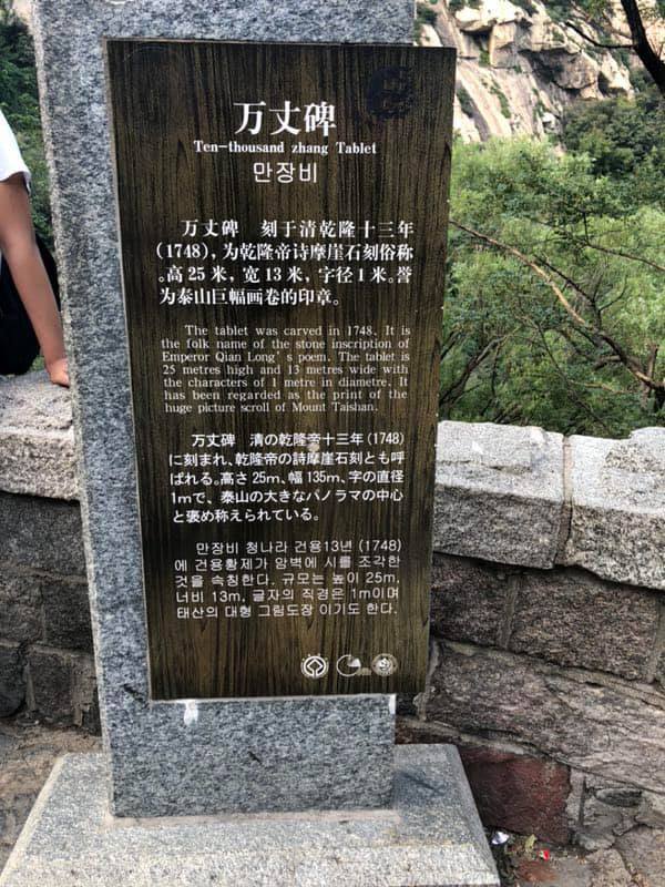 (紀泰山銘。唐摩崖碑とも呼ばれ、高さ13.3m、幅5.7mあり、刻まれている序文や銘文は全部で1008文字ある。唐の玄宗皇帝が泰山で封禅したときのことが記された碑である。)