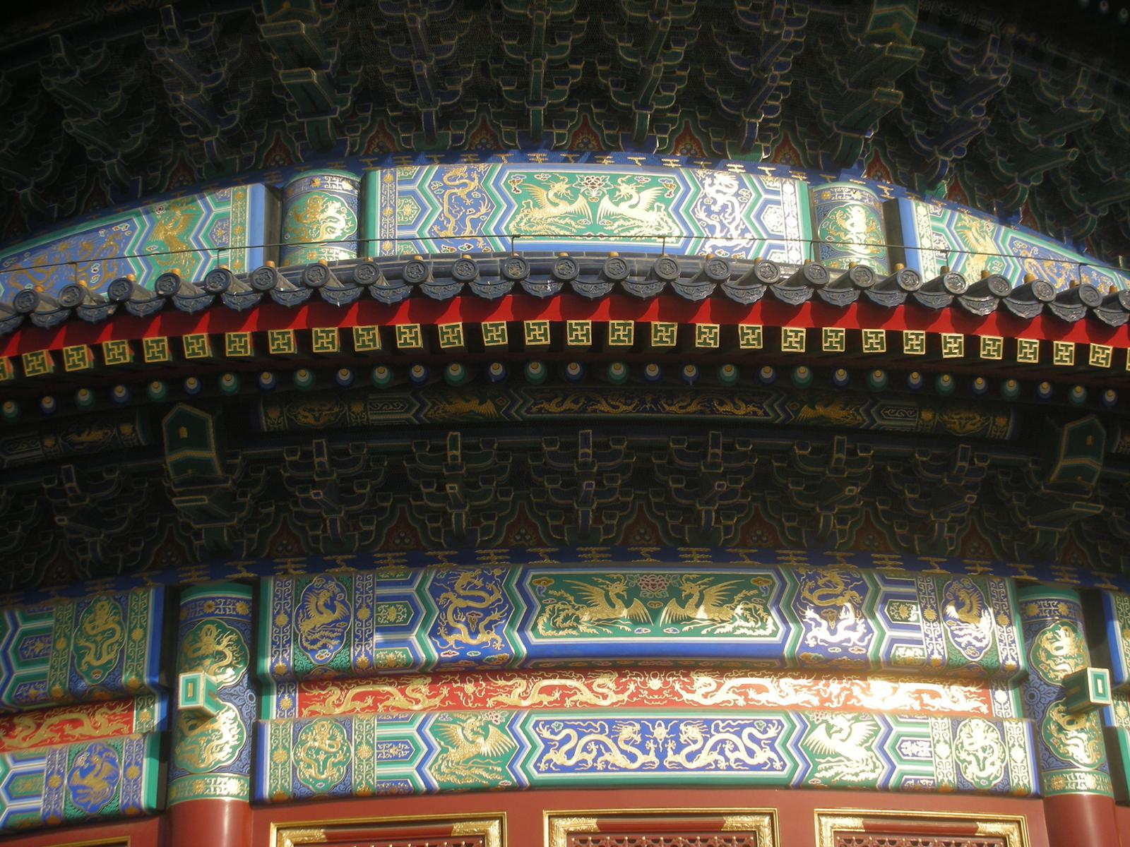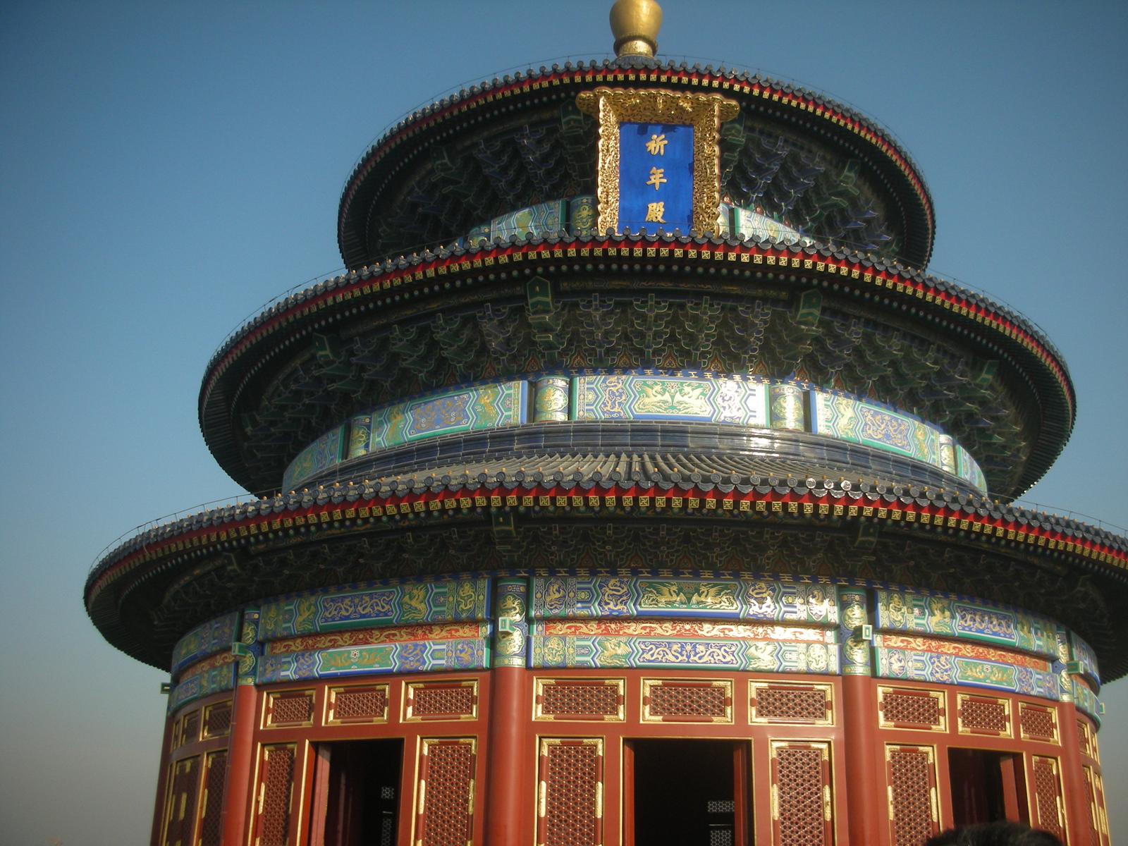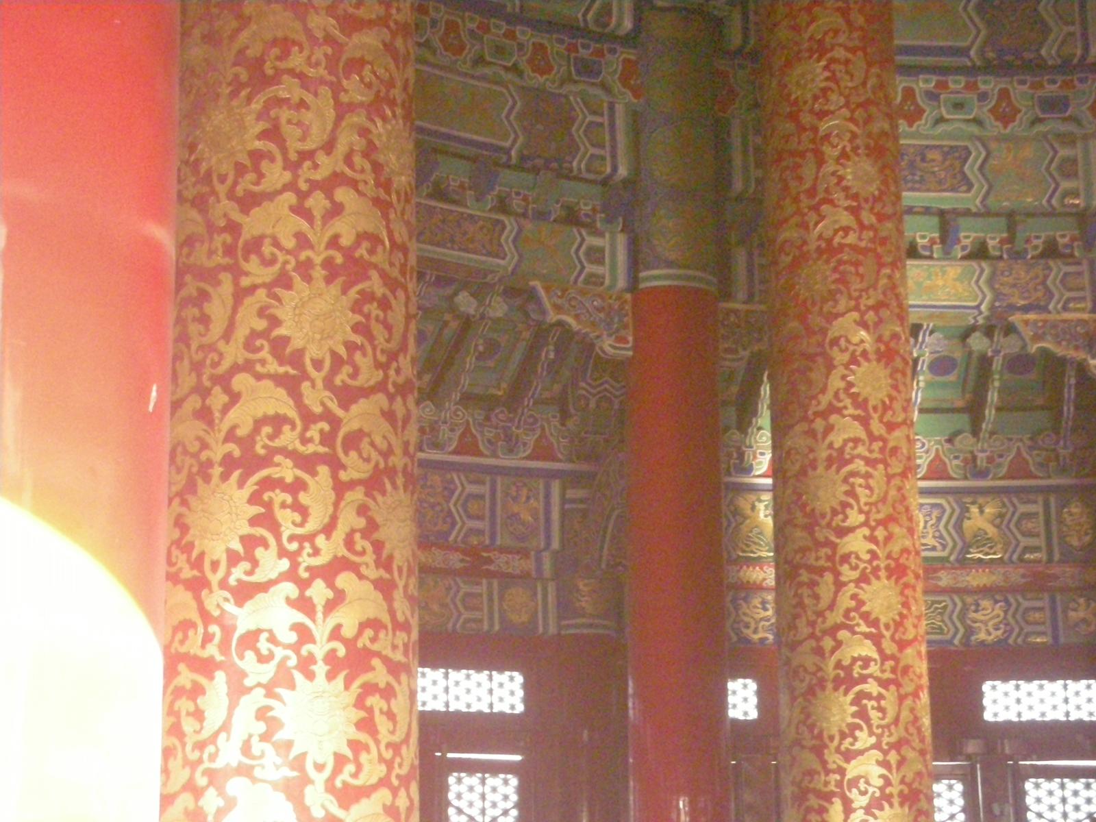 また天壇公園の中には皇帝が月の上辛(最初の辛の日)に五穀豊穣を祈った祈谷壇もあります。金色をふんだに使った内観には四季を表す絵柄の描かれた4本の柱が中央に、12ヶ月を表す12本の柱が外側にそびえ、それぞれの柱には皇帝の力を示す鳳凰や龍が彫刻されています。基壇は3層で構成されていて、それぞれ地上、雲上、天上を表しています。