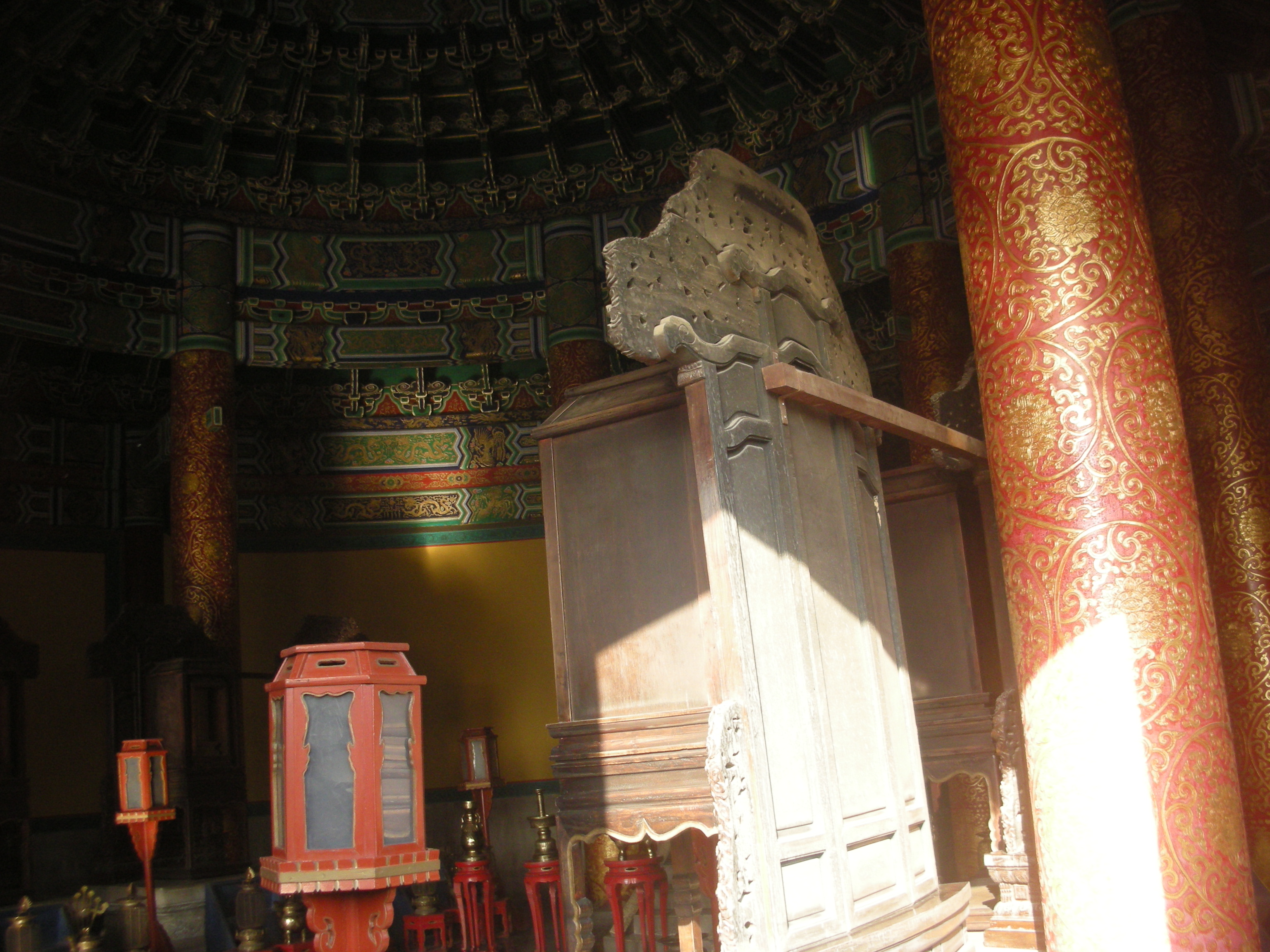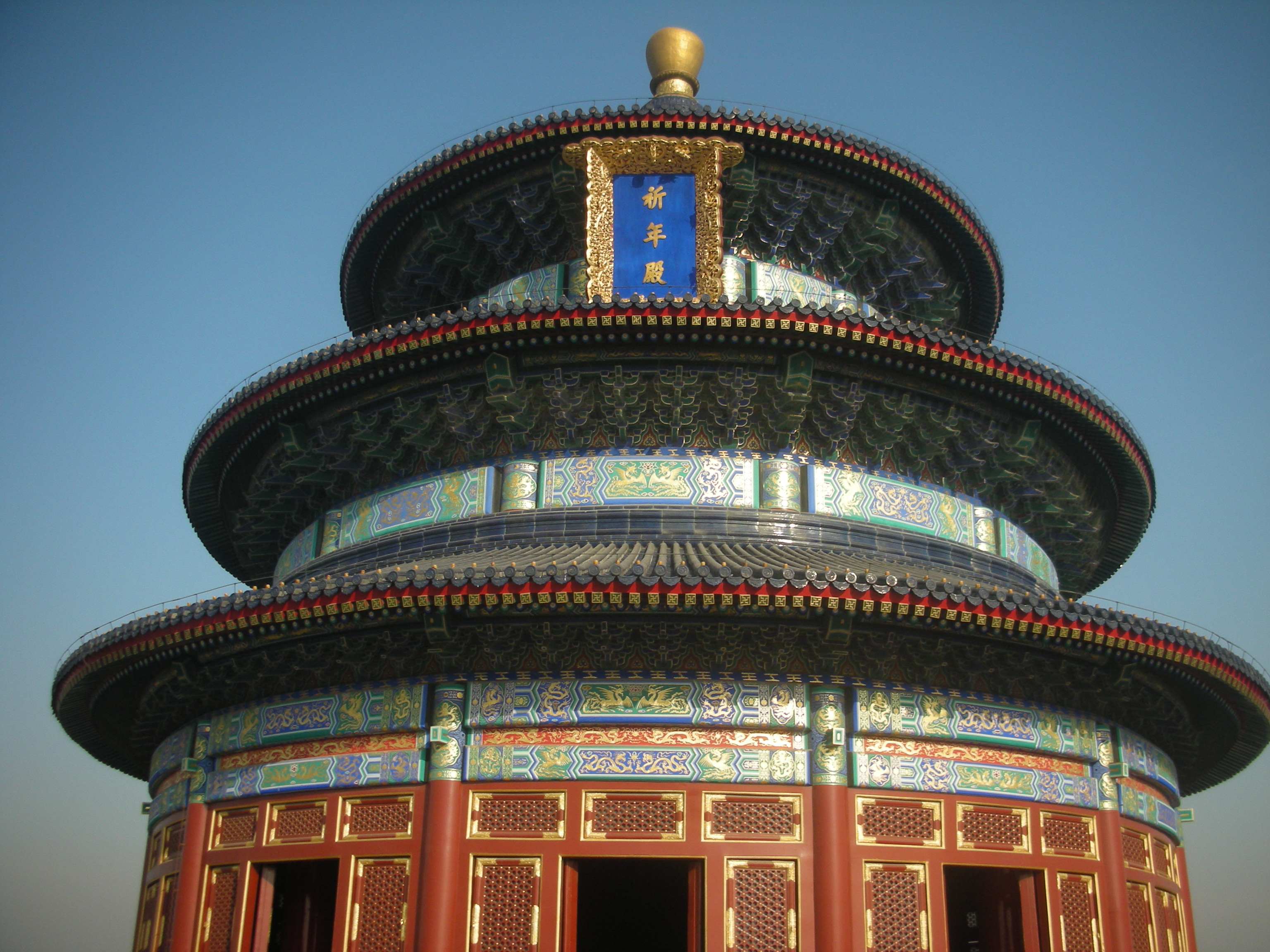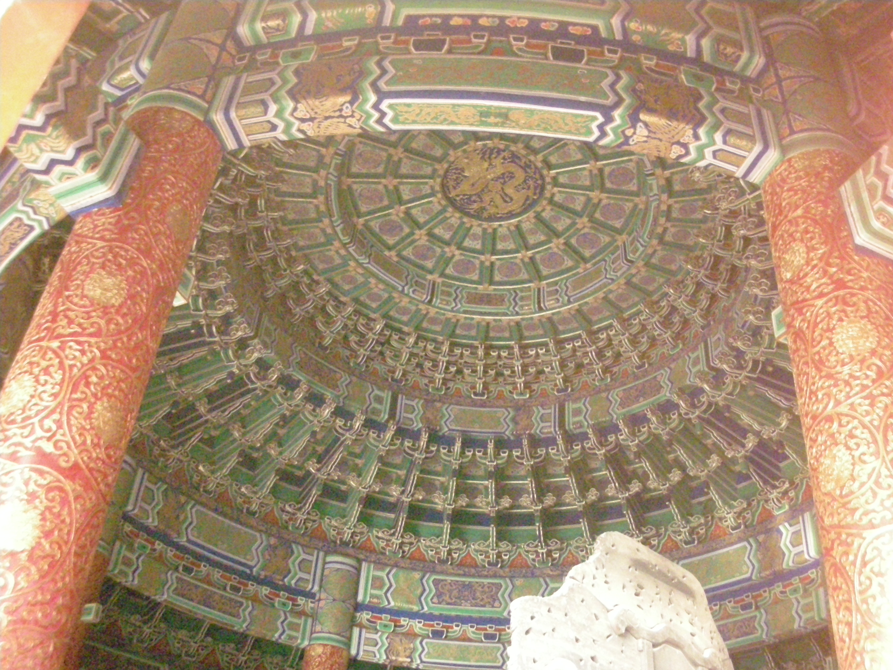また天壇公園の中には皇帝が月の上辛(最初の辛の日)に五穀豊穣を祈った祈谷壇もあります。金色をふんだに使った内観には四季を表す絵柄の描かれた4本の柱が中央に、12ヶ月を表す12本の柱が外側にそびえ、それぞれの柱には皇帝の力を示す鳳凰や龍が彫刻されています。基壇は3層で構成されていて、それぞれ地上、雲上、天上を表しています。