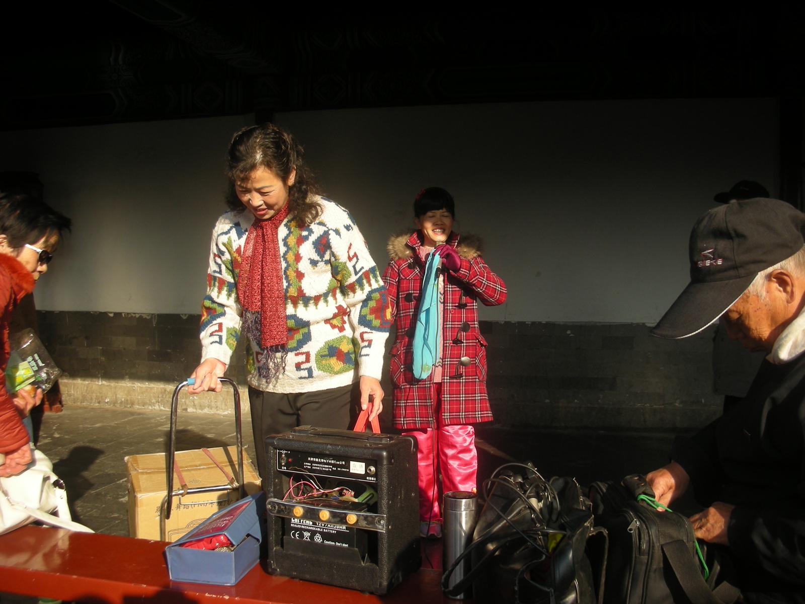 (祈年殿前で歌を歌うおばさん。)