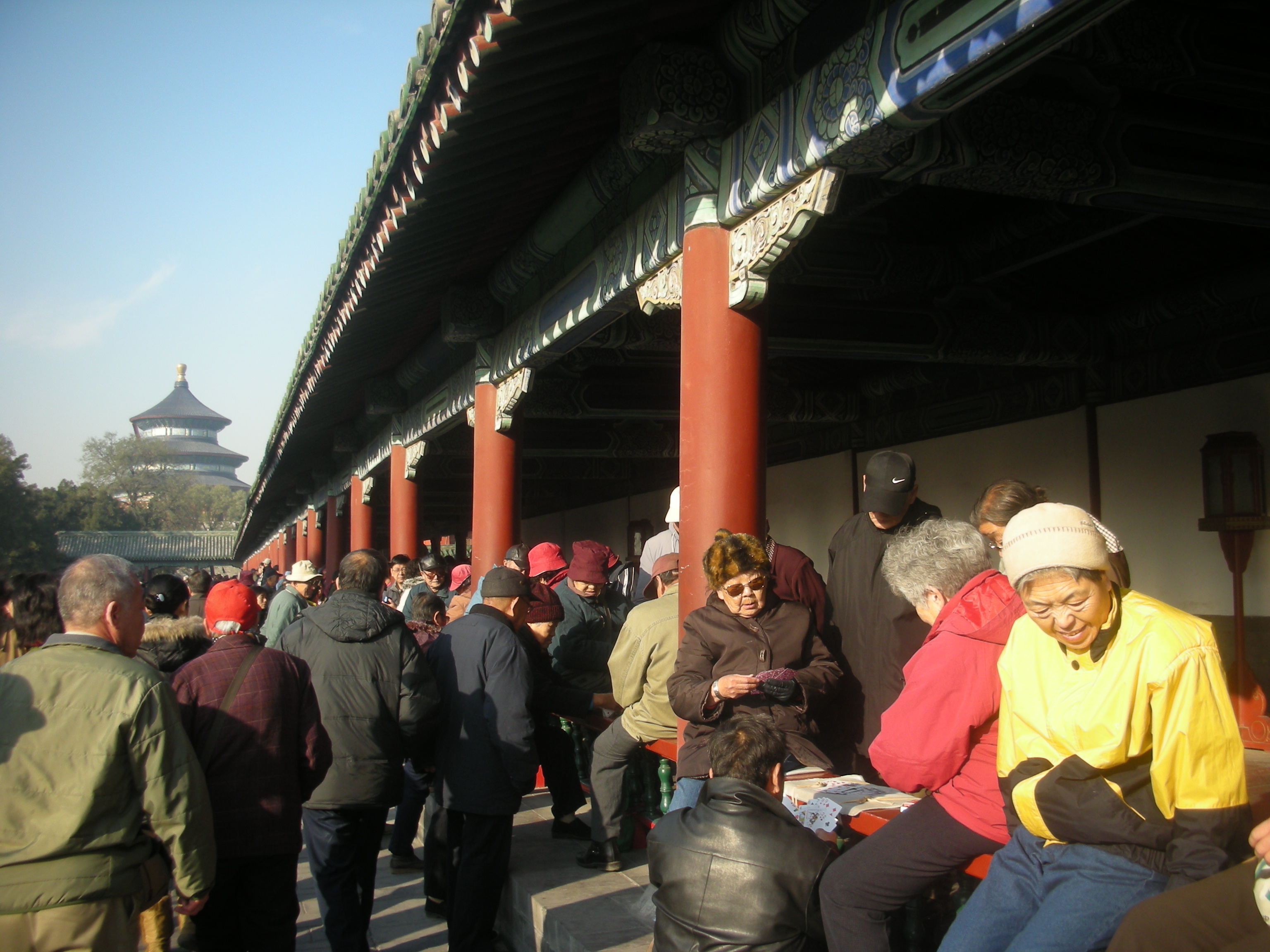 (長廊で遊ぶ人々。老人が多い。)