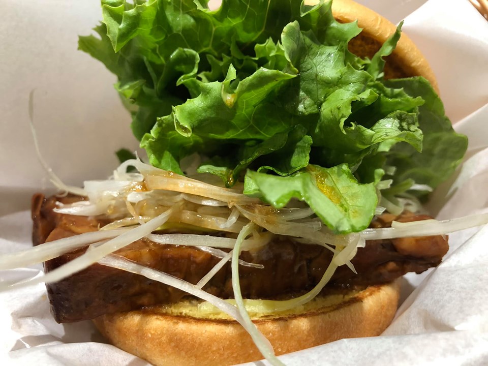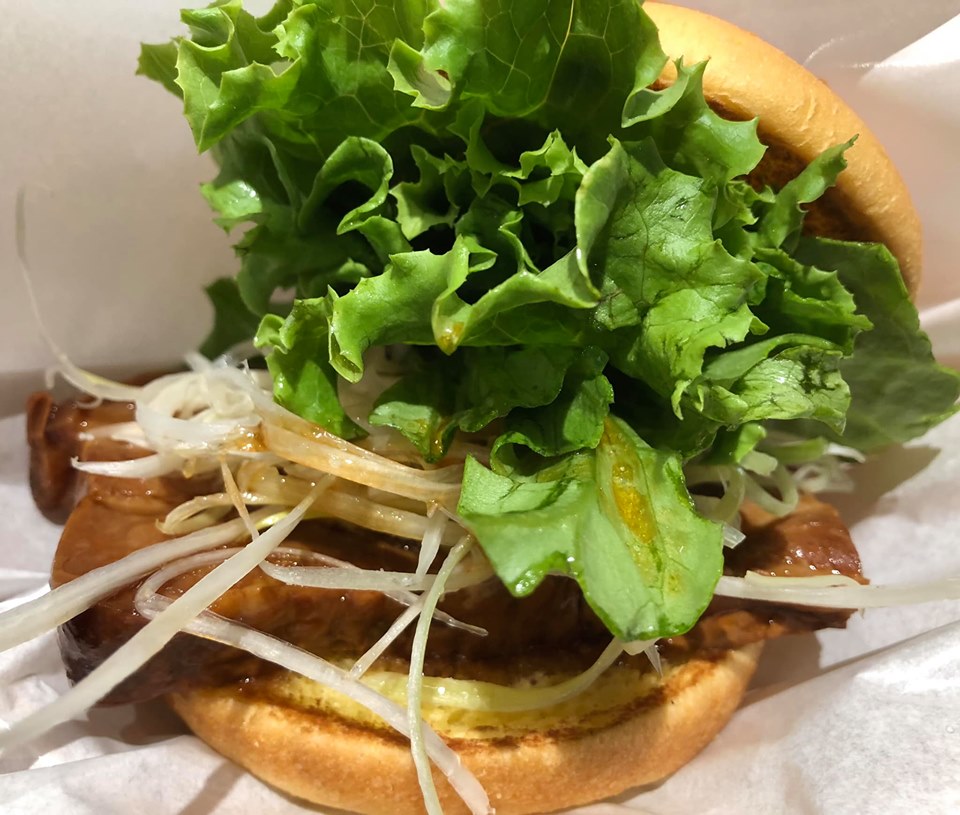 トンポーローバーガーは東坡肉(トンポーロー)を白髪ネギと緑野菜とともに、カボチャを練り込んだバンズで挟んだものです。東坡肉は甘みのあるソースで味つけしており、口に入れると東坡肉がとろける程、甘柔らかく、お野菜と白髪ねぎがよいアクセントとなっていました。しかし辛子がやや入りすぎていて鼻から抜け、ちょっとむせてしまいました。 個人的には甘い東坡肉の味を楽しみたかったので少し残念に感じました。