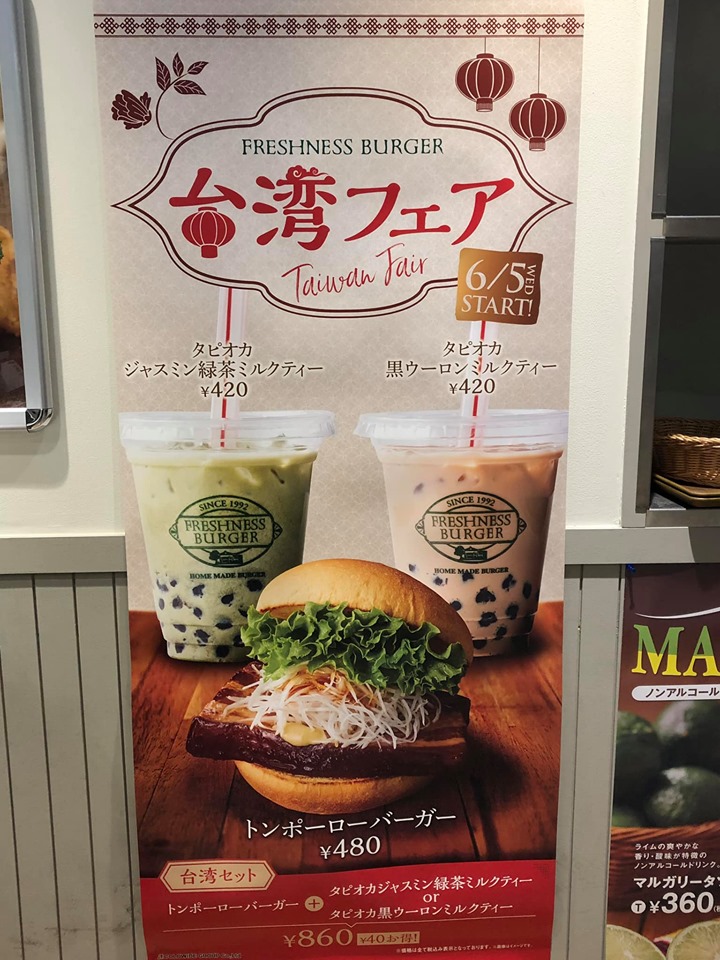 この台湾フェアにはタピオカミルクティもセットにすると付いてきます。タピオカはもちもちの食感で甘いのですが、ミルクティーは甘くなく、トンポーローバーガーを食べながら飲むのにはちょうどいい甘さです。