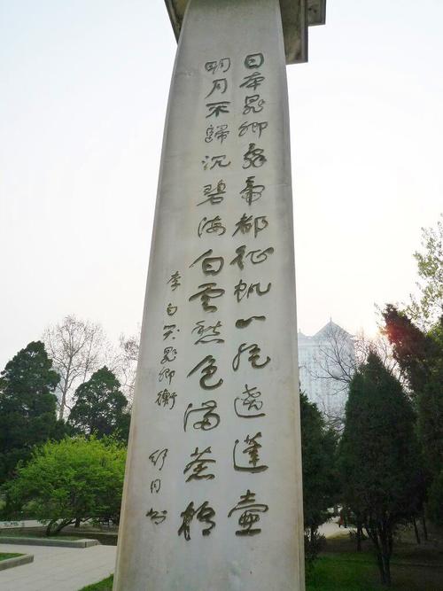 興慶公園にある阿倍仲麻呂の記念碑は大理石作りの美しい記念碑の高さは6.1m、碑の正面には金文字で「阿倍仲麻呂記念碑」と刻まれ、側面には阿倍仲麻呂が故郷の奈良を偲んで詠んだ望郷詩「天の原 ふりさけ見れば 春日なる 三笠の山に いでし月かも」が刻まれています。当の詩人李白が仲麻呂を哭す詩がそれぞれ掘られています。遠い異郷で長い年月を過ごし、日本人からも唐の人々からも信頼され、素晴らしい友人を持った仲麻呂さんは、結果的には故郷に帰れなかったけれど、とても幸せだったのではないでしょうか。
