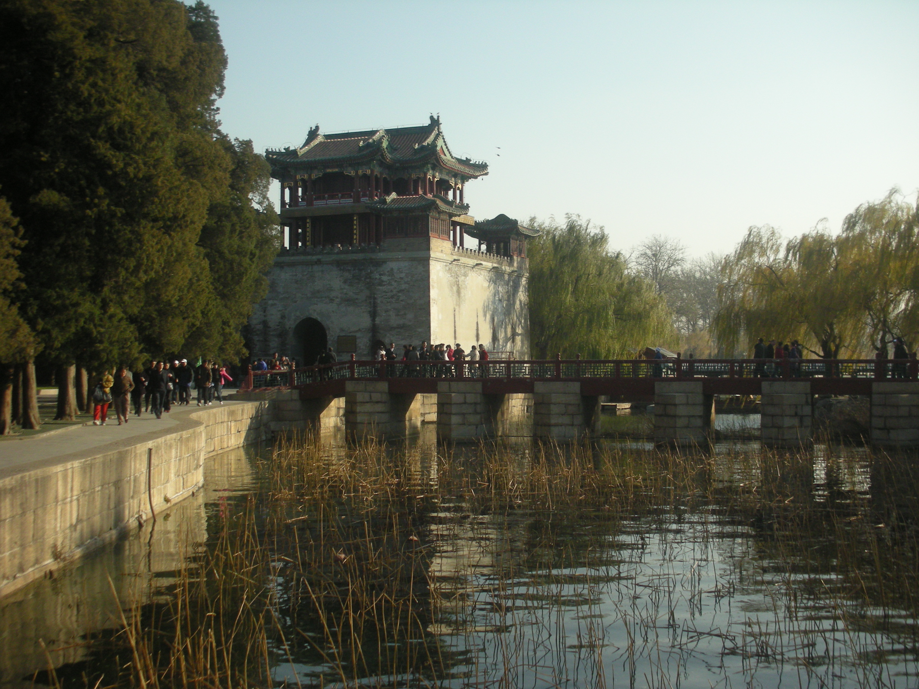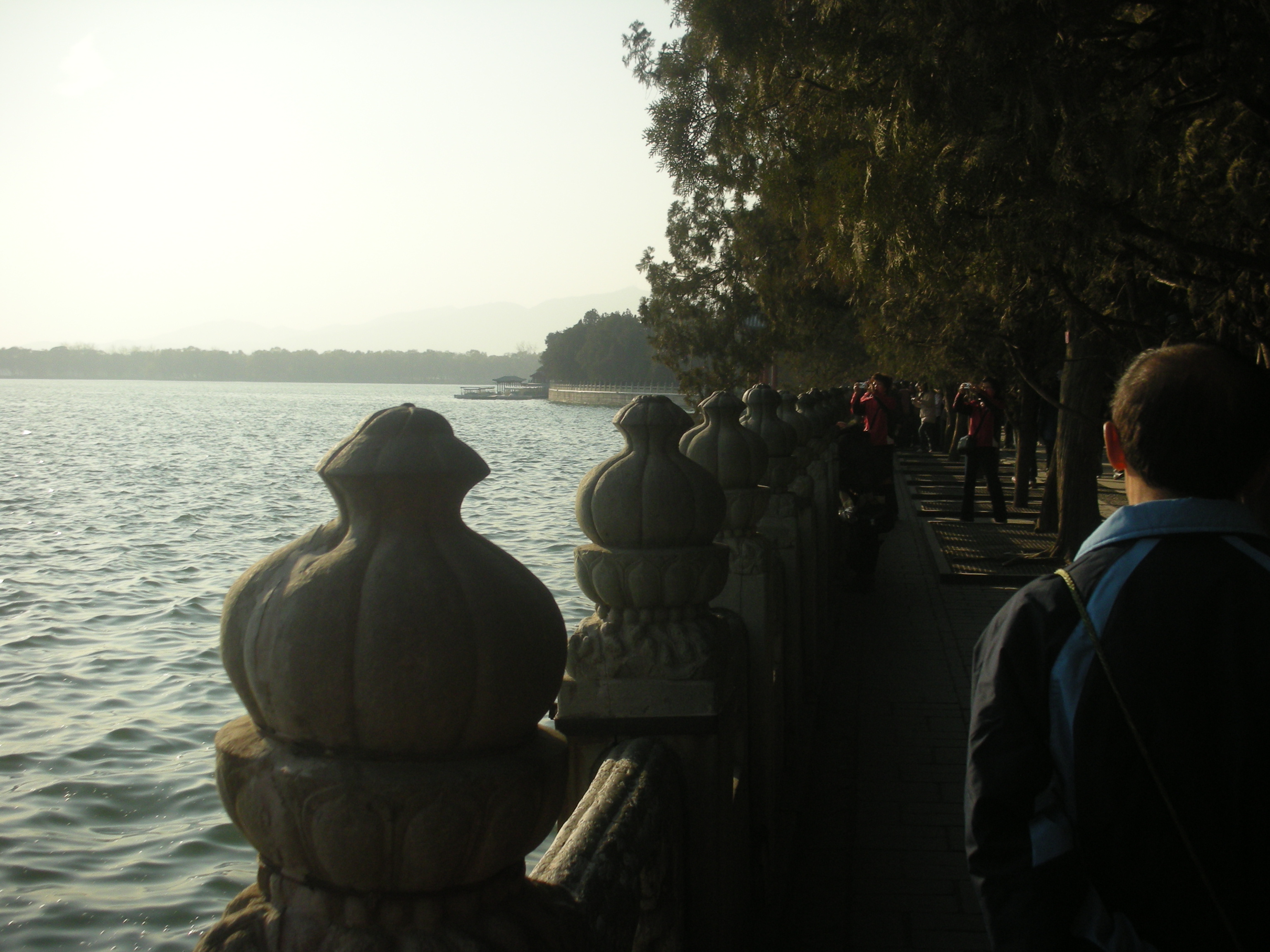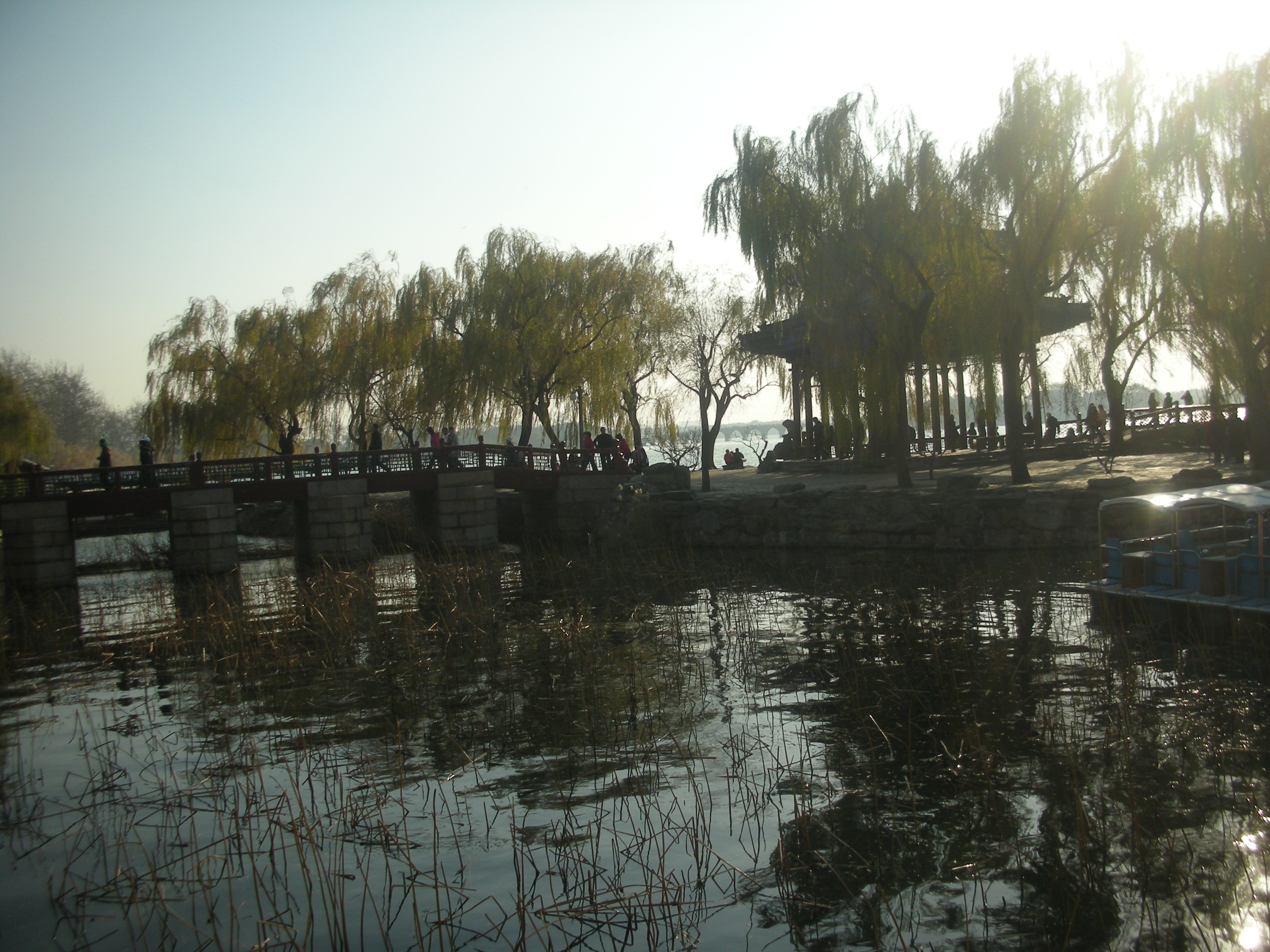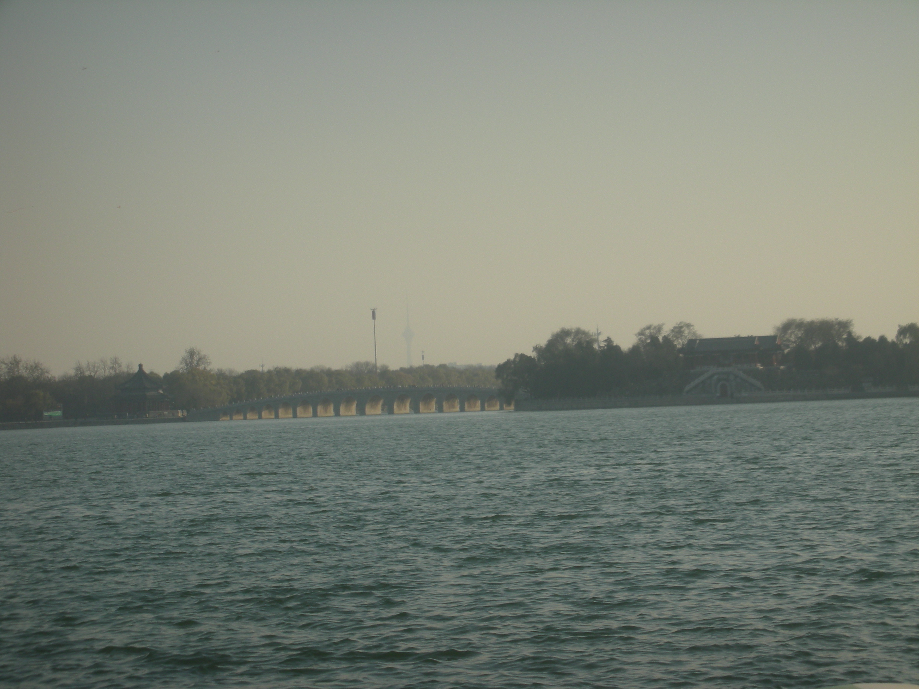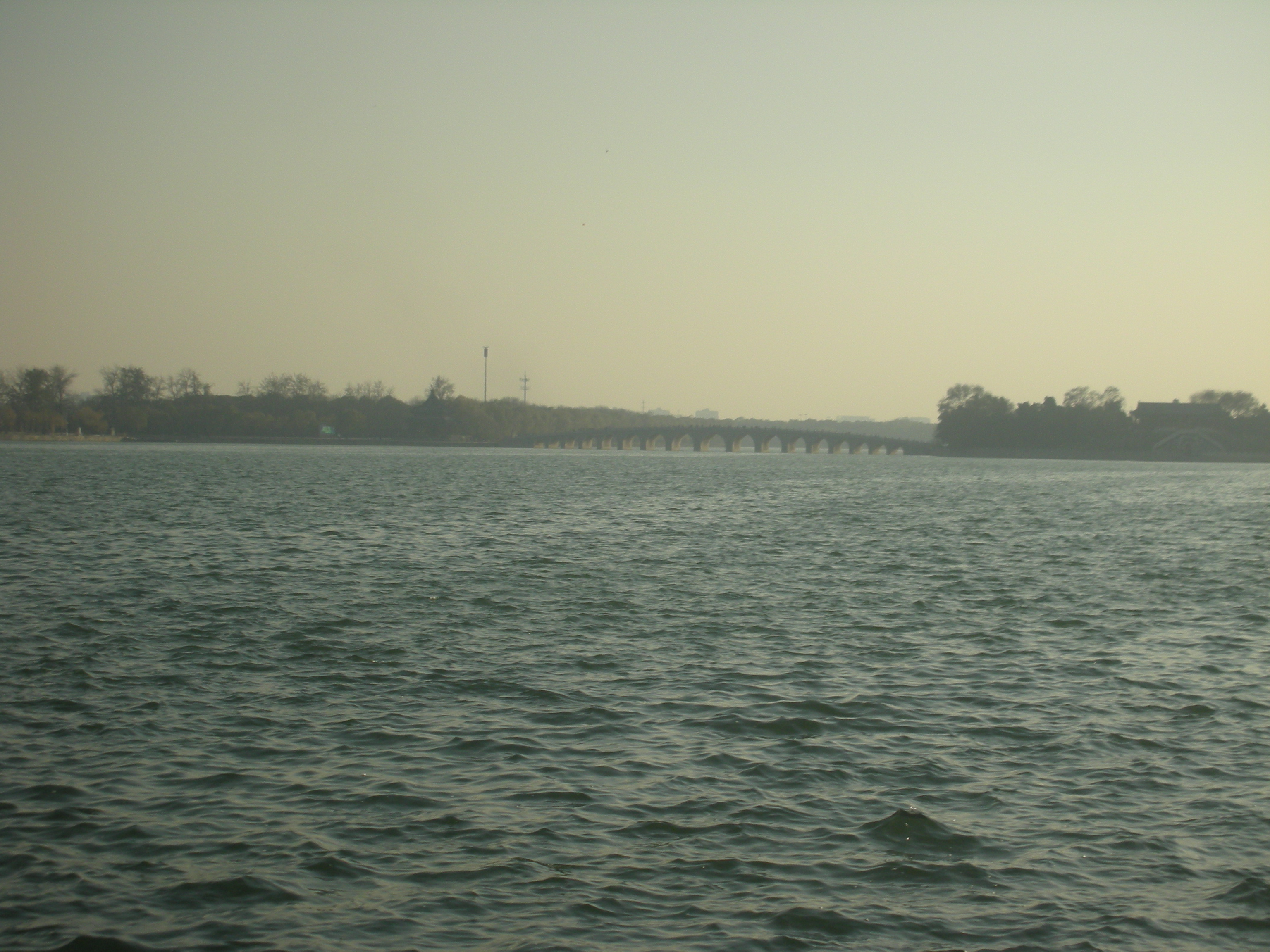 (昆明池を臨みます。十七孔橋と南湖島。)