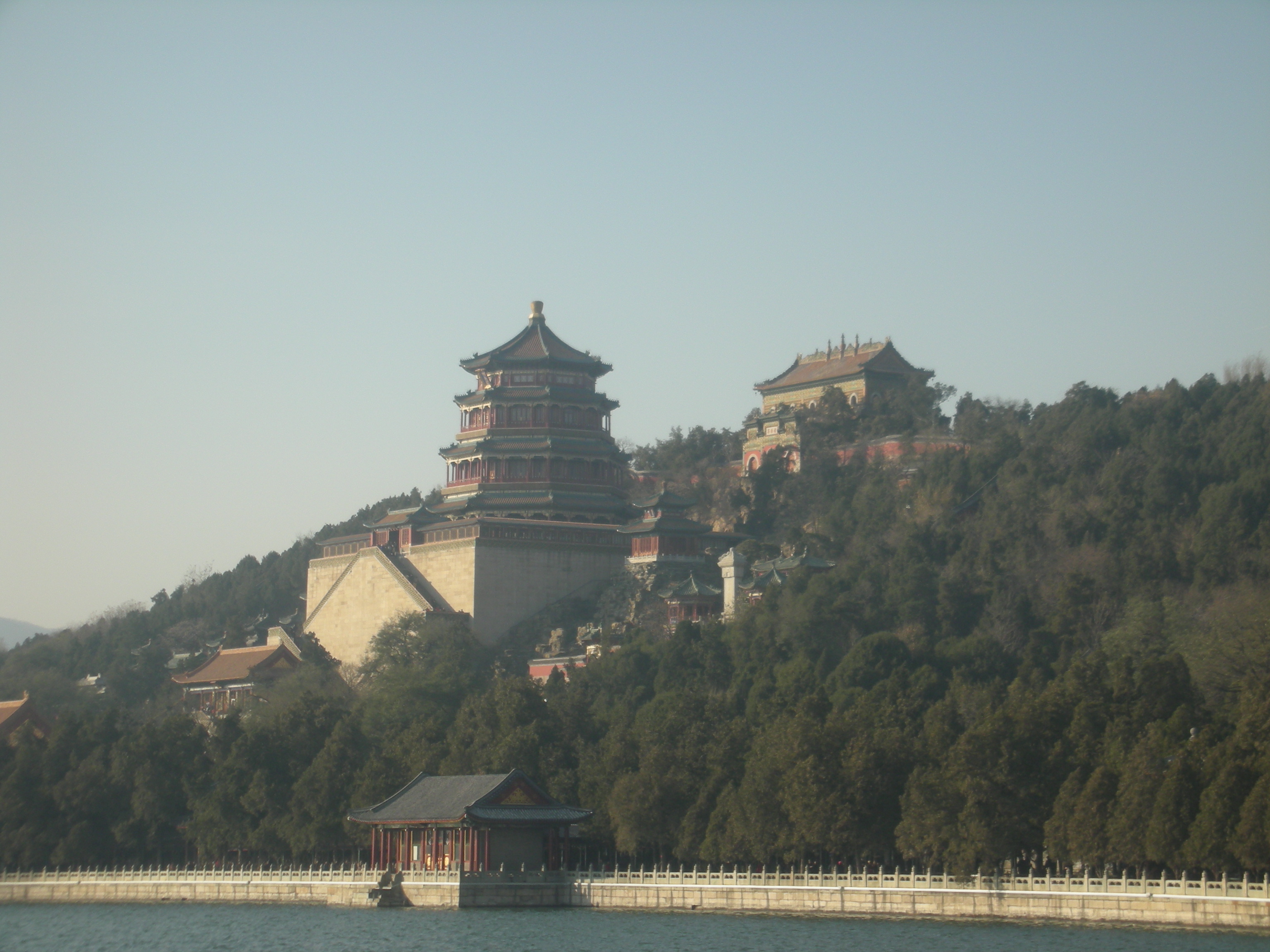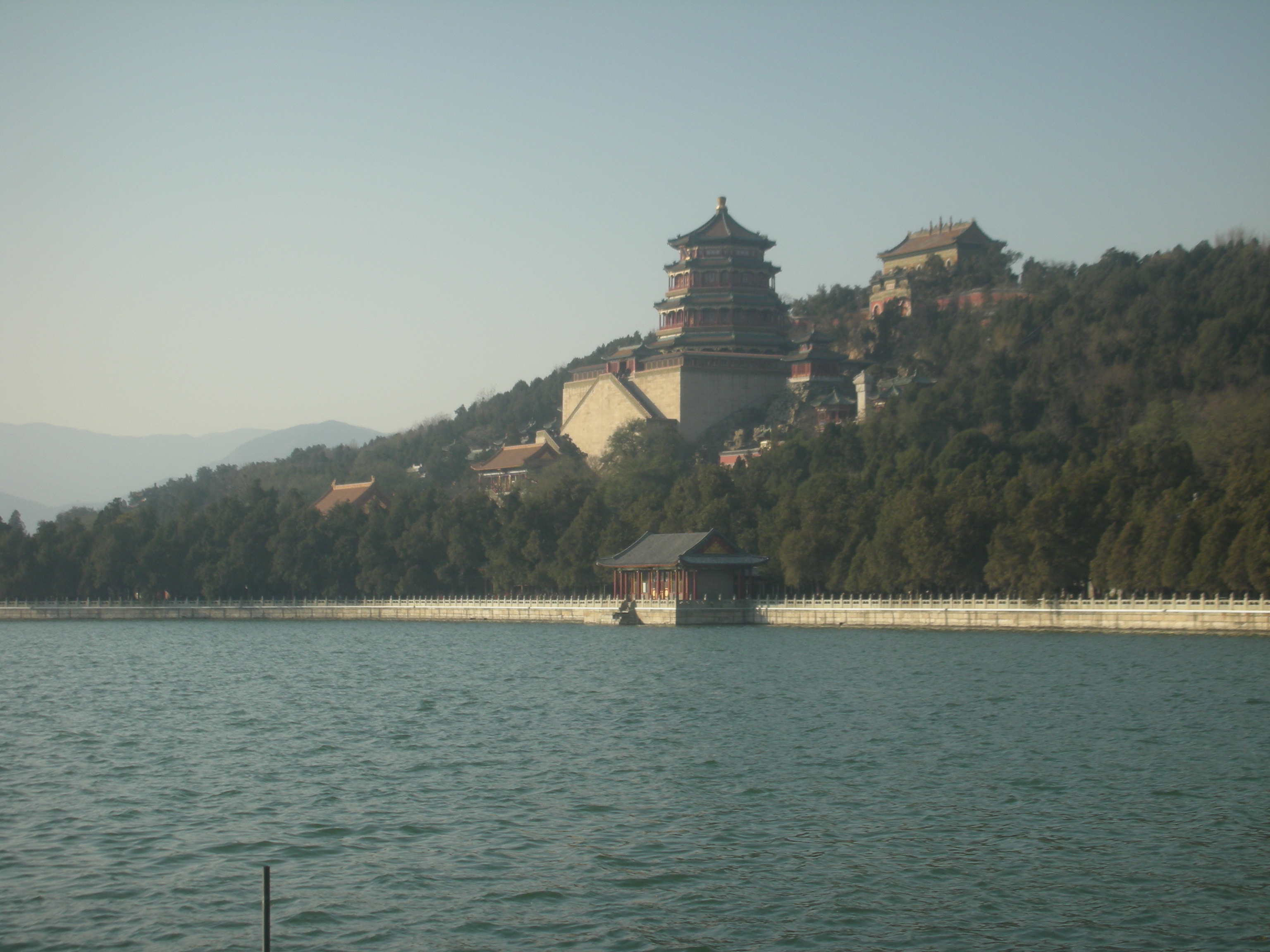 (昆明湖と万寿山上にある仏香閣。万寿山も昆明湖もすべて人工のものです。)