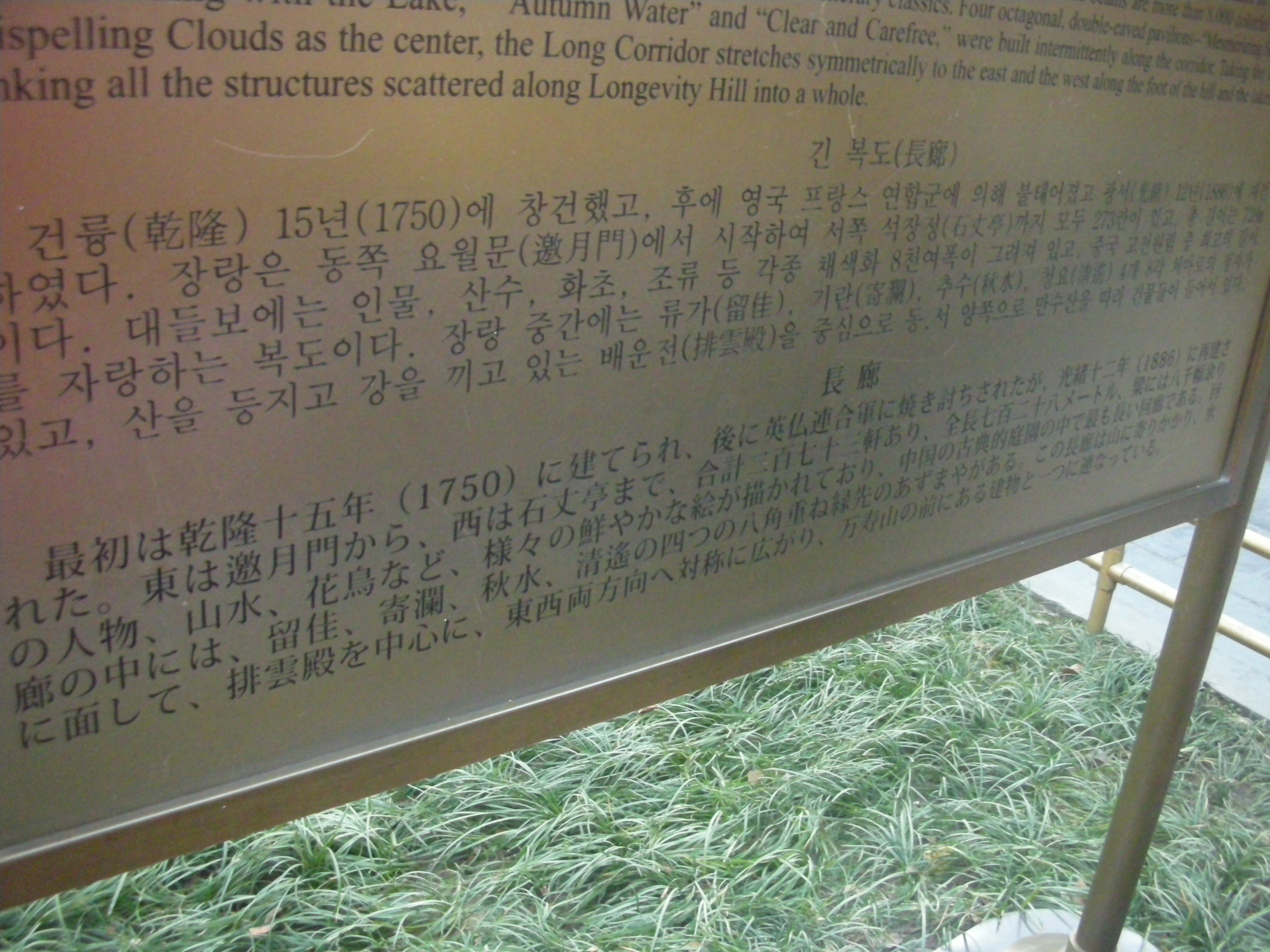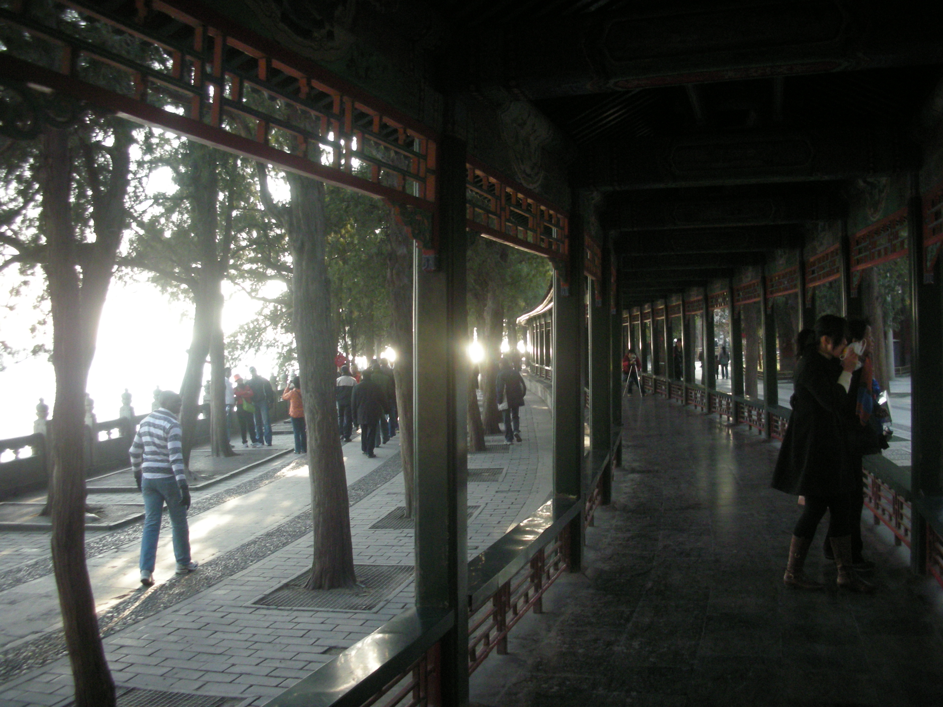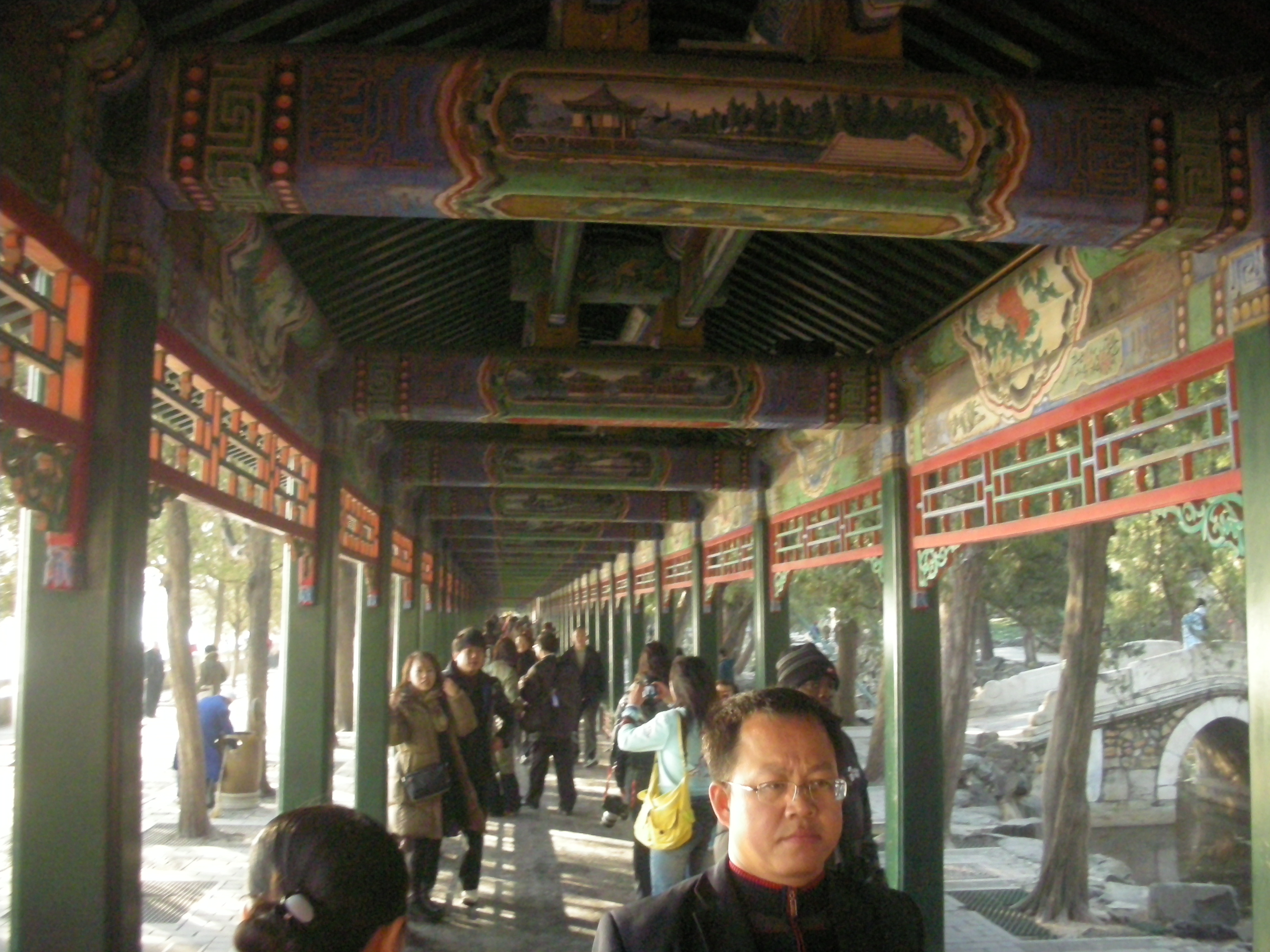 (長廊。750mにもなる極彩画が多く書かれた廊下。万寿山の南端から昆明湖に沿うように長廊が長く続きます。なんと全長728mとのことです。1992年には世界一長い長廊としてギネス認定されています。)