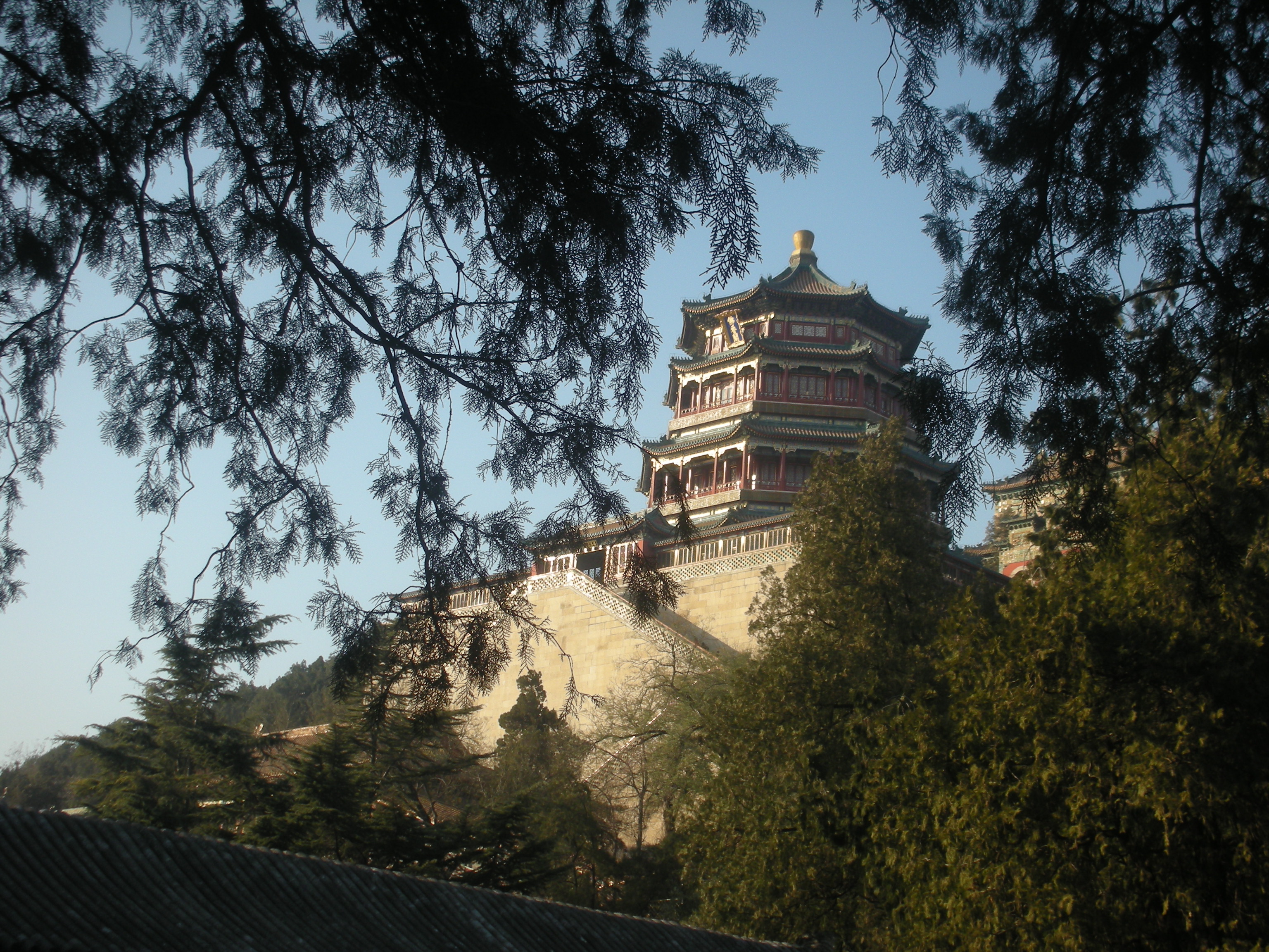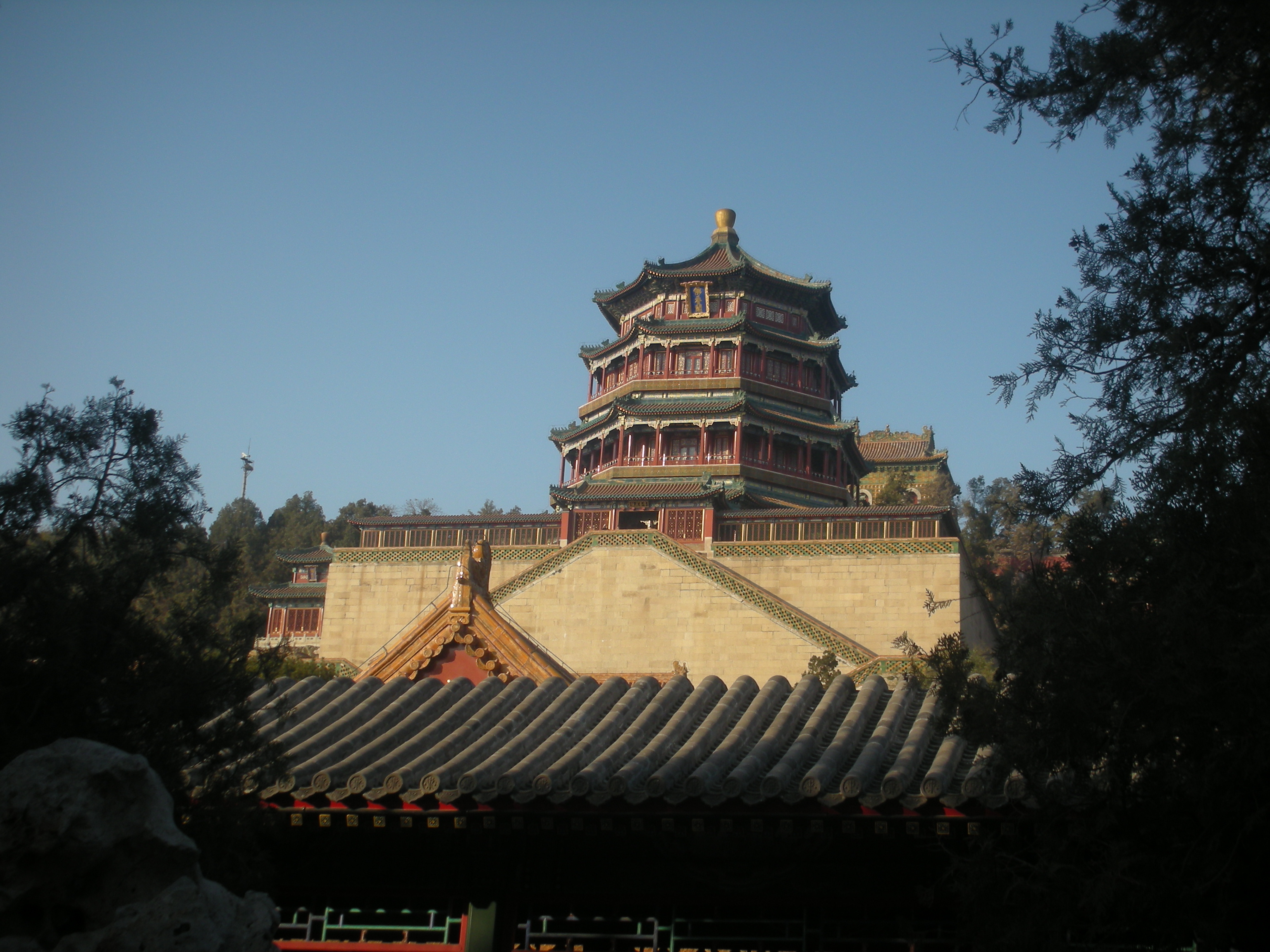 (昆明湖と万寿山上にある仏香閣。乾隆帝が母の健康と長寿を祝って建てた8角3層の塔。20mの基壇の上に36.5mの塔は実際に観ると壮大さに圧倒される。西太后が再建した際に内部に「千手音菩薩堂」を安置した。)