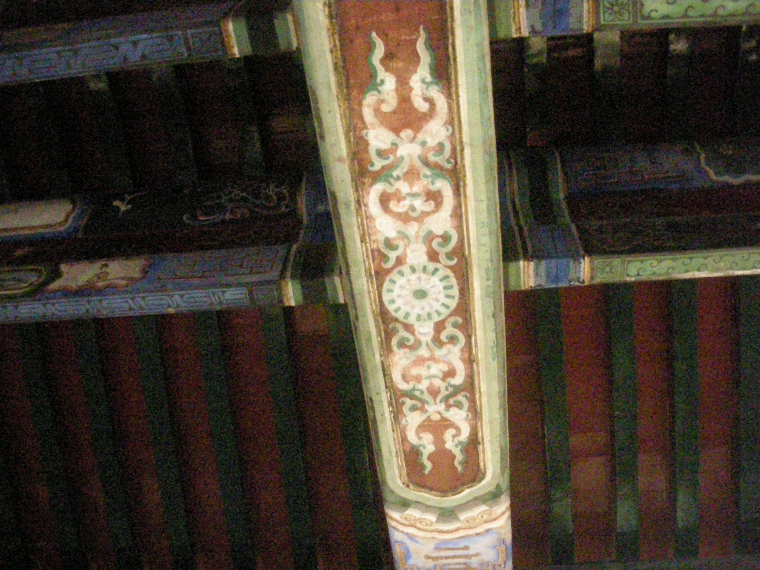 (長廊の壁画。長廊の梁の上には絵も描かれています。絵には歴史、文学、神話の内容などが書かれています。)