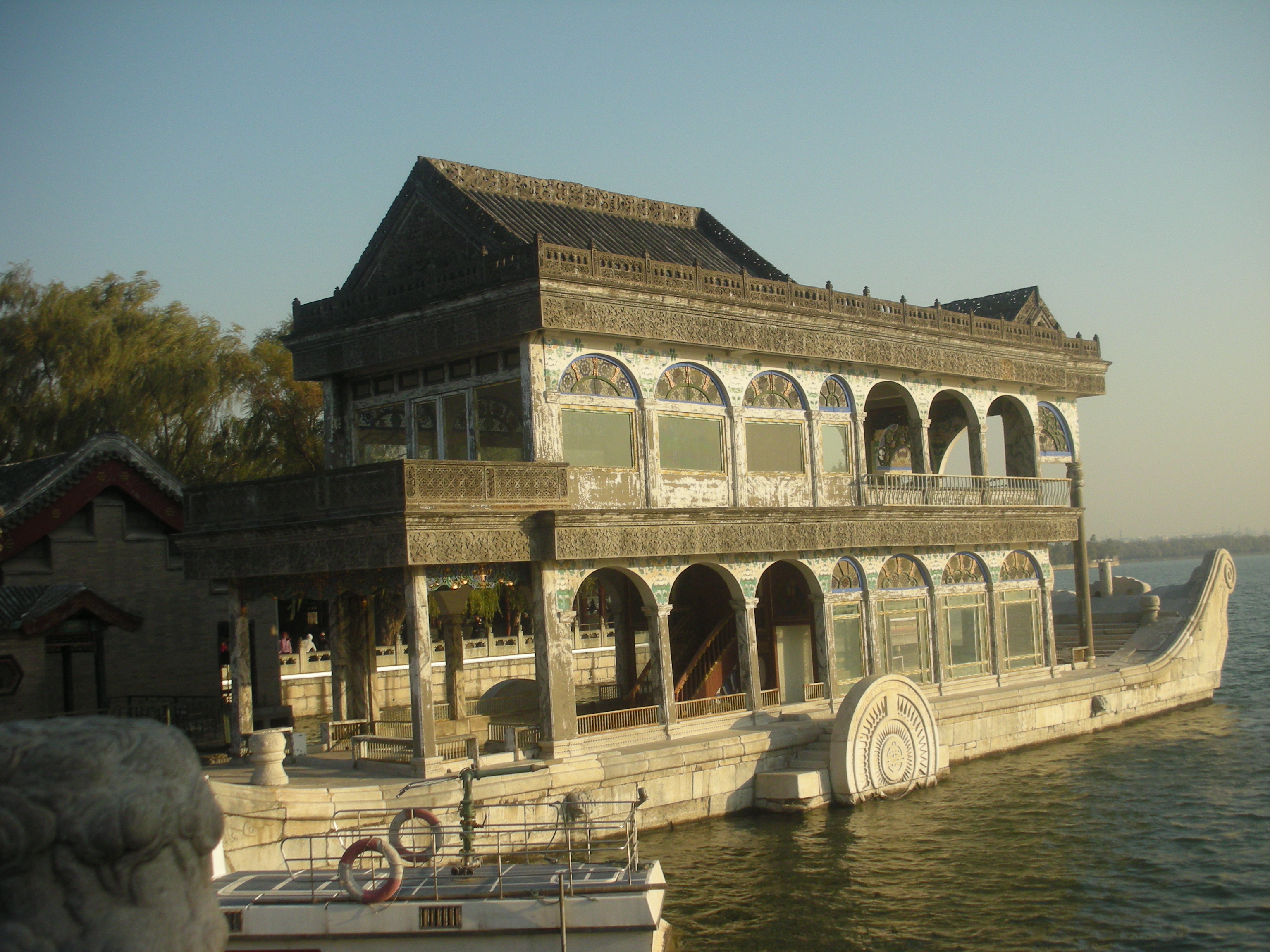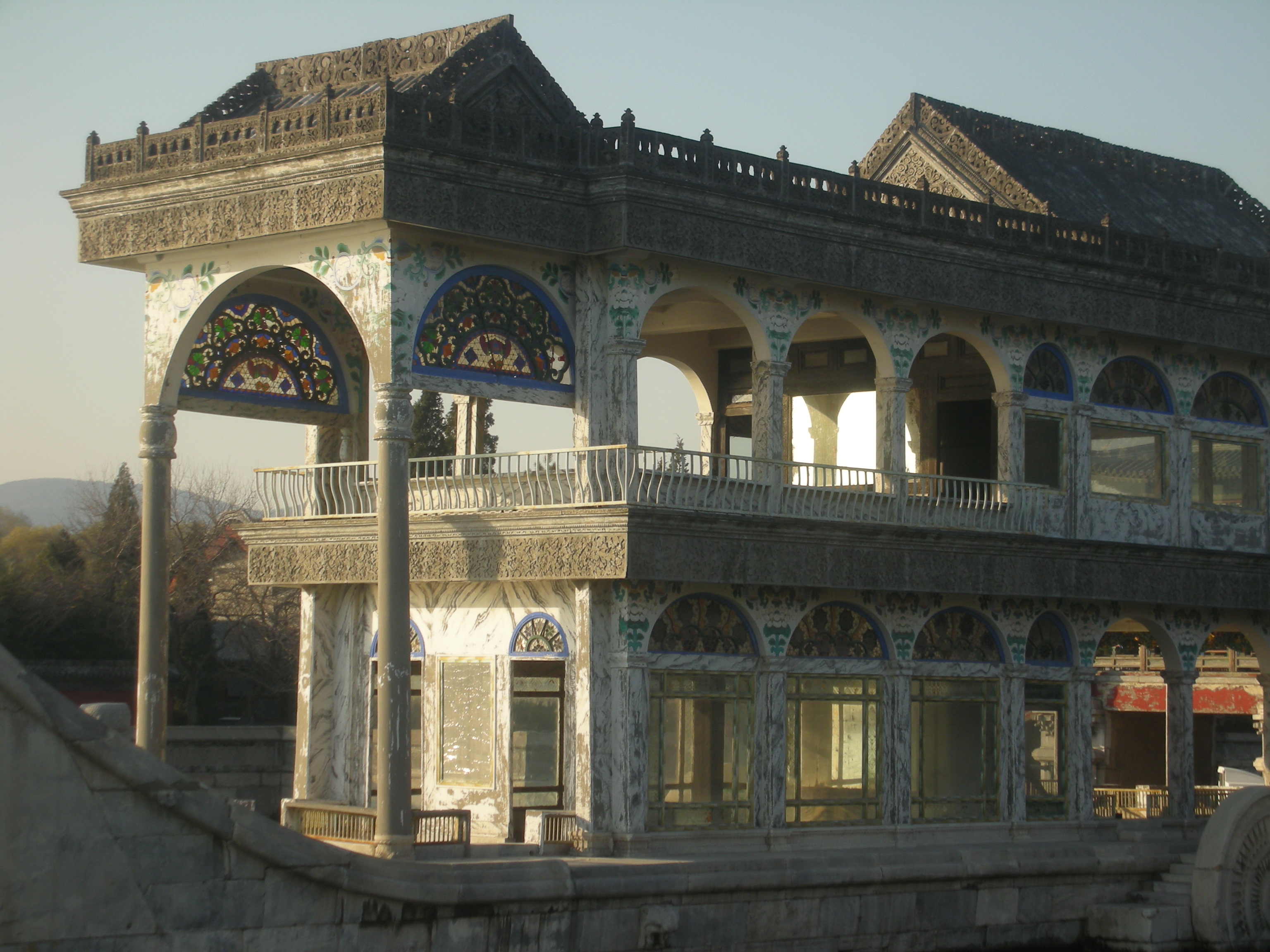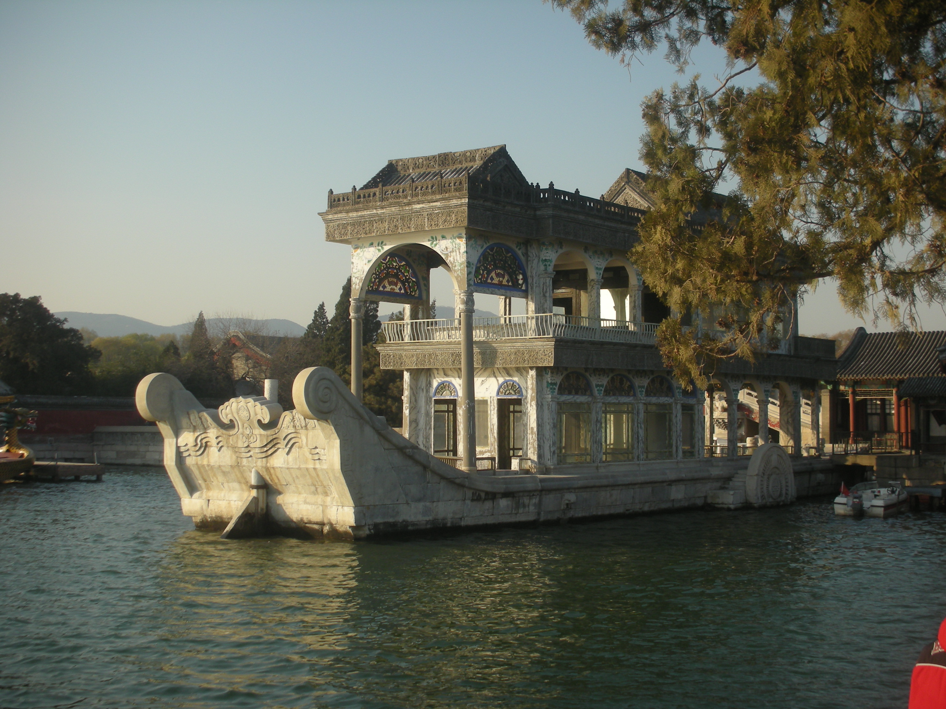 1860年に英仏連合により破壊され、荒廃したものを西太后が贅の限りを尽くした避暑地として再建したものです。西太后は昆明湖に浮かぶ、全長36メートルの大理石の清晏舫を建設しました。内部は木造でステンドグラスの美しい西洋式建築で、頤和園の中で唯一の様式の建造物です。これらを再建するために、西太后は1888年に海軍の造艦資金を流用するなど膨大な費用をかけて再建しました。これが財政悪化を招き、日清戦争に負けた要因の一つといわれています。