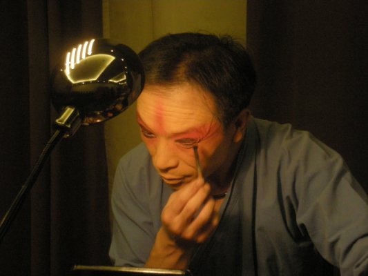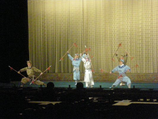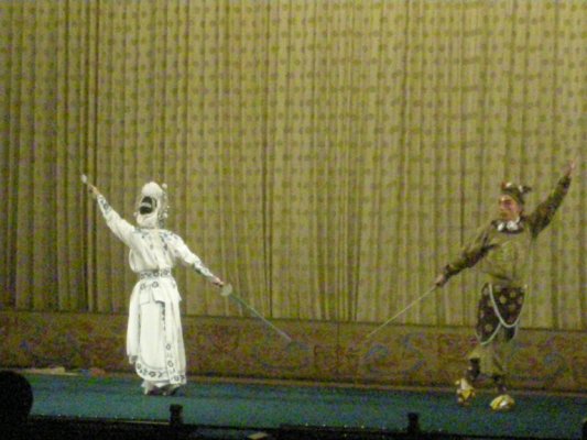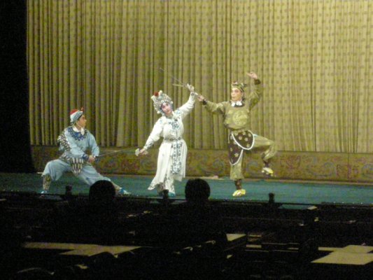 甲高い声と独特の??という独特の顔全体を塗り潰した化粧法が特徴的です。??の色によって役柄が決まっており、「赤」は必ず関羽です。また、一人だけおとぼけ役がいて、面白いメイクをしているので、すぐに分かります。