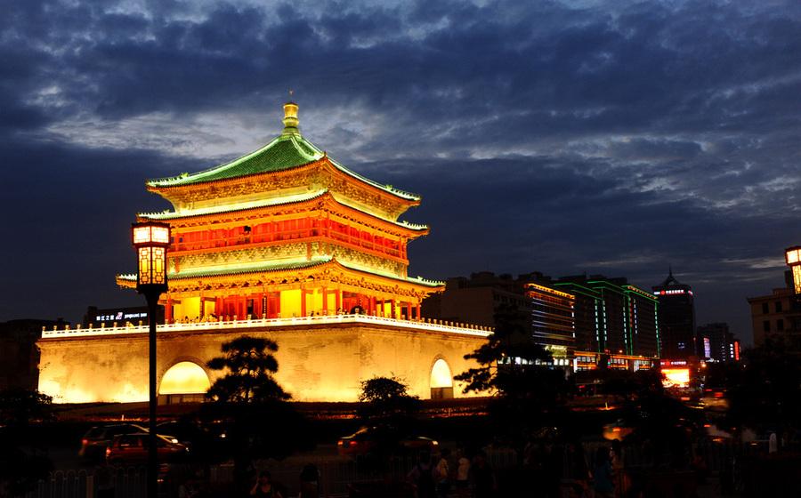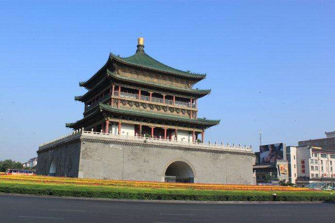 西安の鐘楼で市内の中心にあり、 城壁内を東西南北に走る大通りのその交差点の真ん中にある木造建築です。かつて明の太祖朱元璋が、西から長安に向かう龍の夢を見ました。その龍は巨大なライバルの出現を意味していると占いに出たことから、龍を鎮めるために建てられたのが、鐘楼の由来であります。外側からみると三階建てですが、中に入ると二階建てという構造で、釘を一本も使わず、一本木で建てられています。かつて鳴り響く大鐘が朝を告げ、その鐘の音を聴きながら、役人たちは宮廷へ向かったといいます。重要な歴史遺産なのです。
